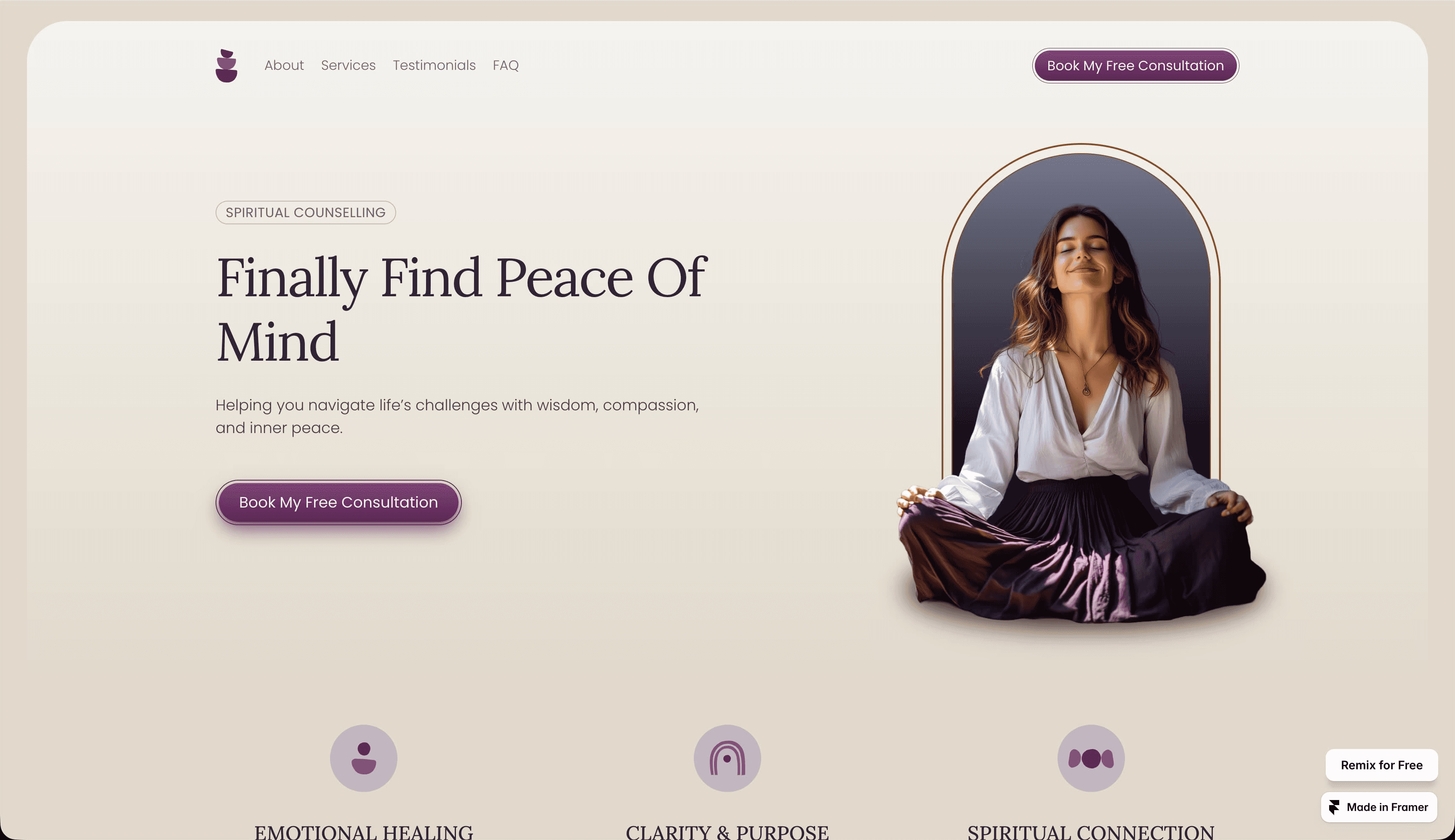 在 Framer 的 Healer 模板中,紫色和温暖中性色共同营造出为柔和调色板增添趣味的色彩亮点。茄紫在展示字体中充当黑色,与较浅的皇家紫搭配,在按钮和背景上创造出流畅的渐变效果。配合拱形照片框和圆角,以及细边框和投影等纹理细节,这个设计既丰富多彩又保持克制。
