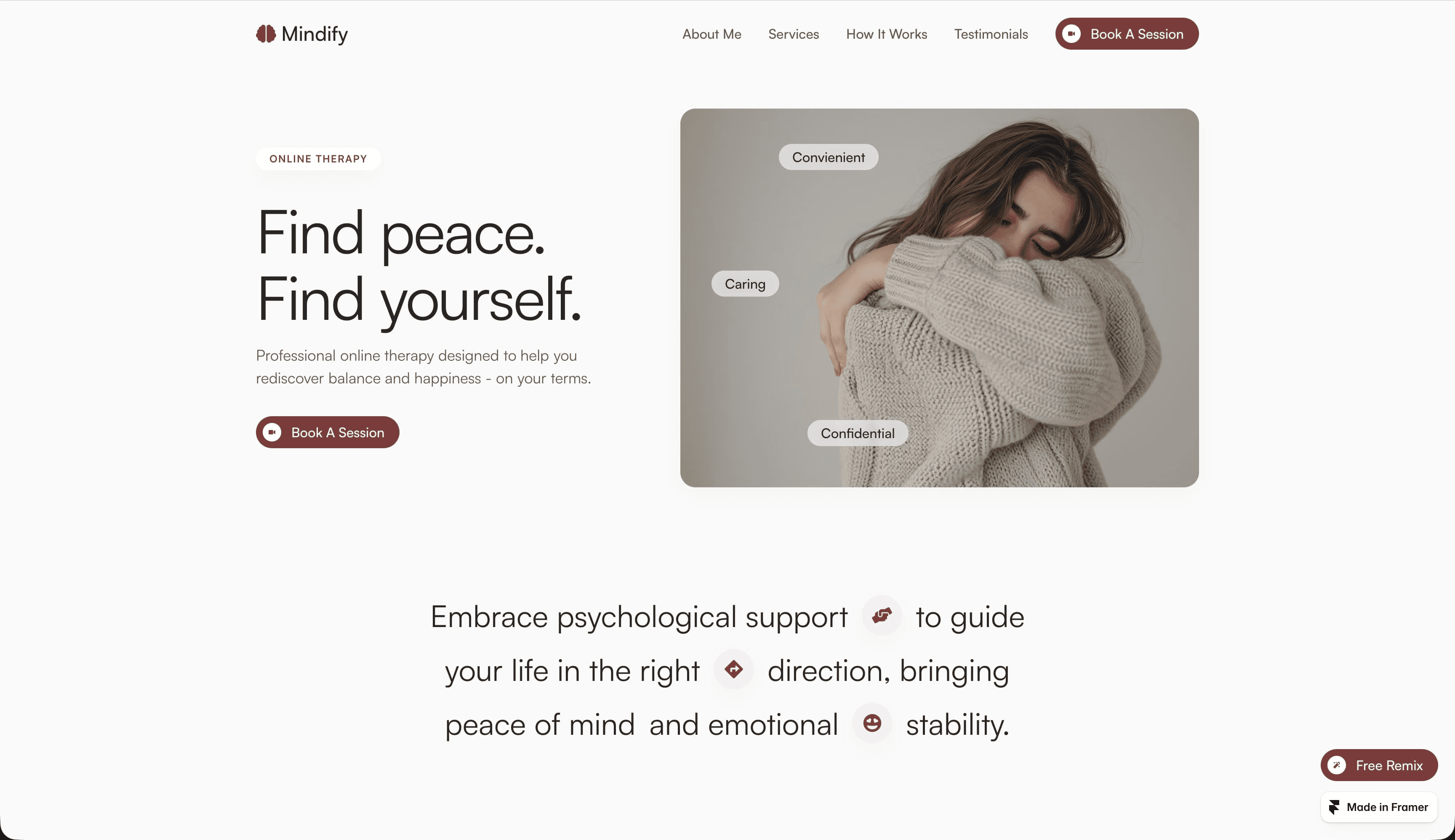 栗色是 Framer 的 Mindify 模板的主调,这是一个单色配色方案,柔和的色调如玫瑰色和加深的色相如栗色为红色赋予了新的诠释。栗色不再是红色通常关联的高能量和紧迫感,深栗色更像是温暖的拥抱。灰色正文有助于轻盈的展示字体突出,图标为原本简约的页面增添了一些个性。对栗色及其色调玫瑰色的聚焦,使这个布局在色彩范围上保持克制。