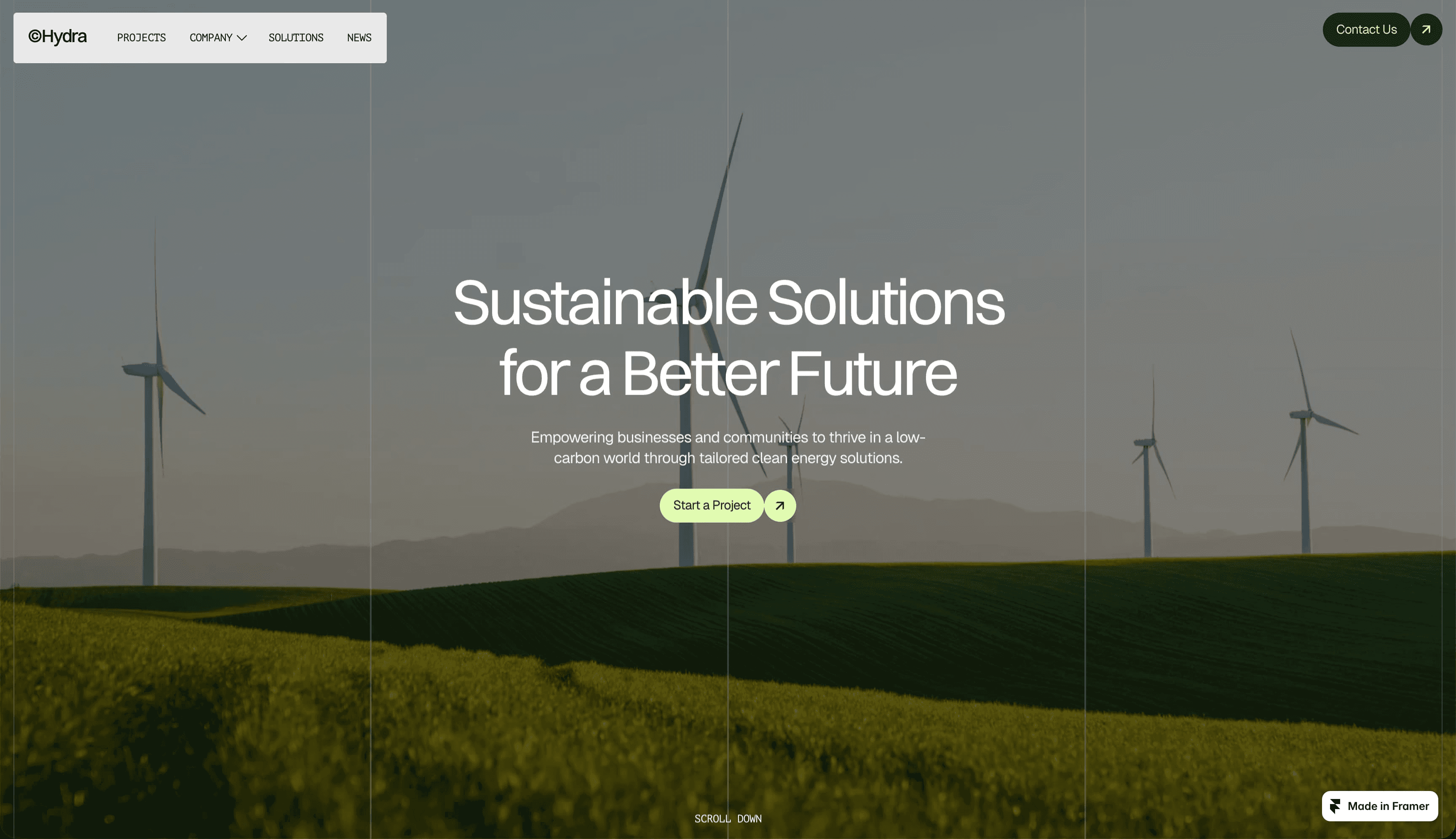 一些最能体现优雅的配色方案是单色系,选择一种主打颜色并探索其全部色域。在 Framer 的 ©Hydra 模板中,焦点是绿色;深青色比标准黑色更有趣味,与柠檬绿形成对比。虽然柠檬绿可能显得混乱,但在这个绿色配色方案中,它与深青色搭配时显得自信从容。