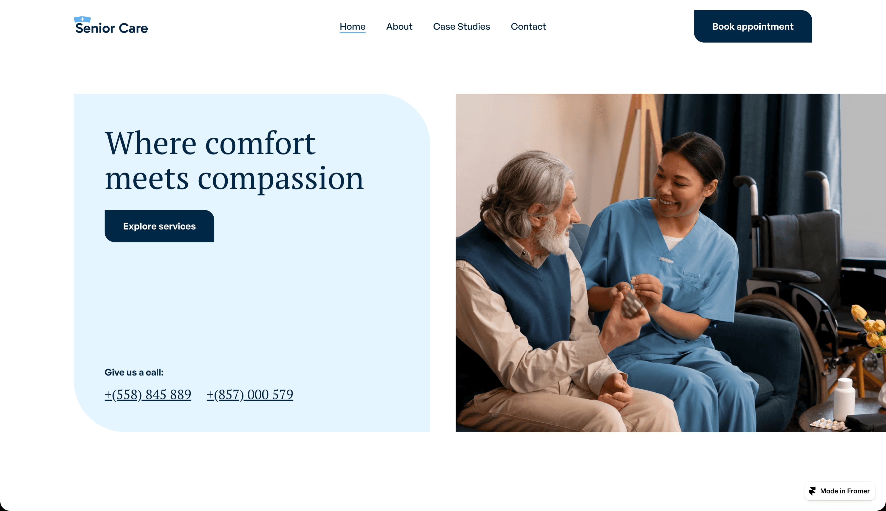 这个用于养老护理机构示例的模板很好地说明了明度如何改变色调。在上面的 Busix 模板中,蓝色更偏灰,传达出严肃感。这里的蓝色更温暖、更明亮,传递出乐观和清晰的信号。使用一种明亮颜色对比较深颜色,使得在整个网站中轻松找到方向,感觉优雅而非混乱或过度刺激。