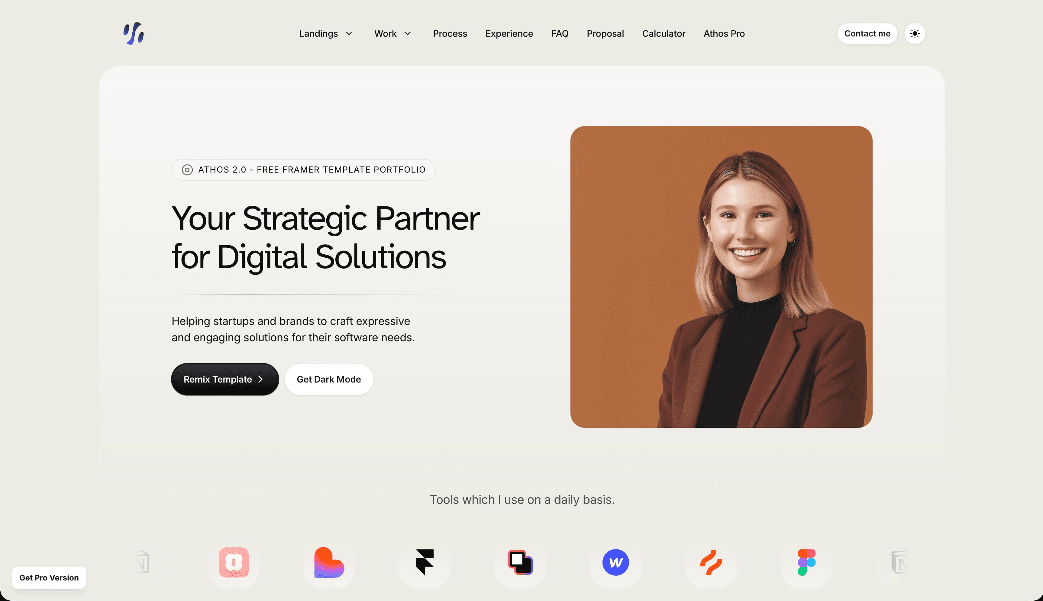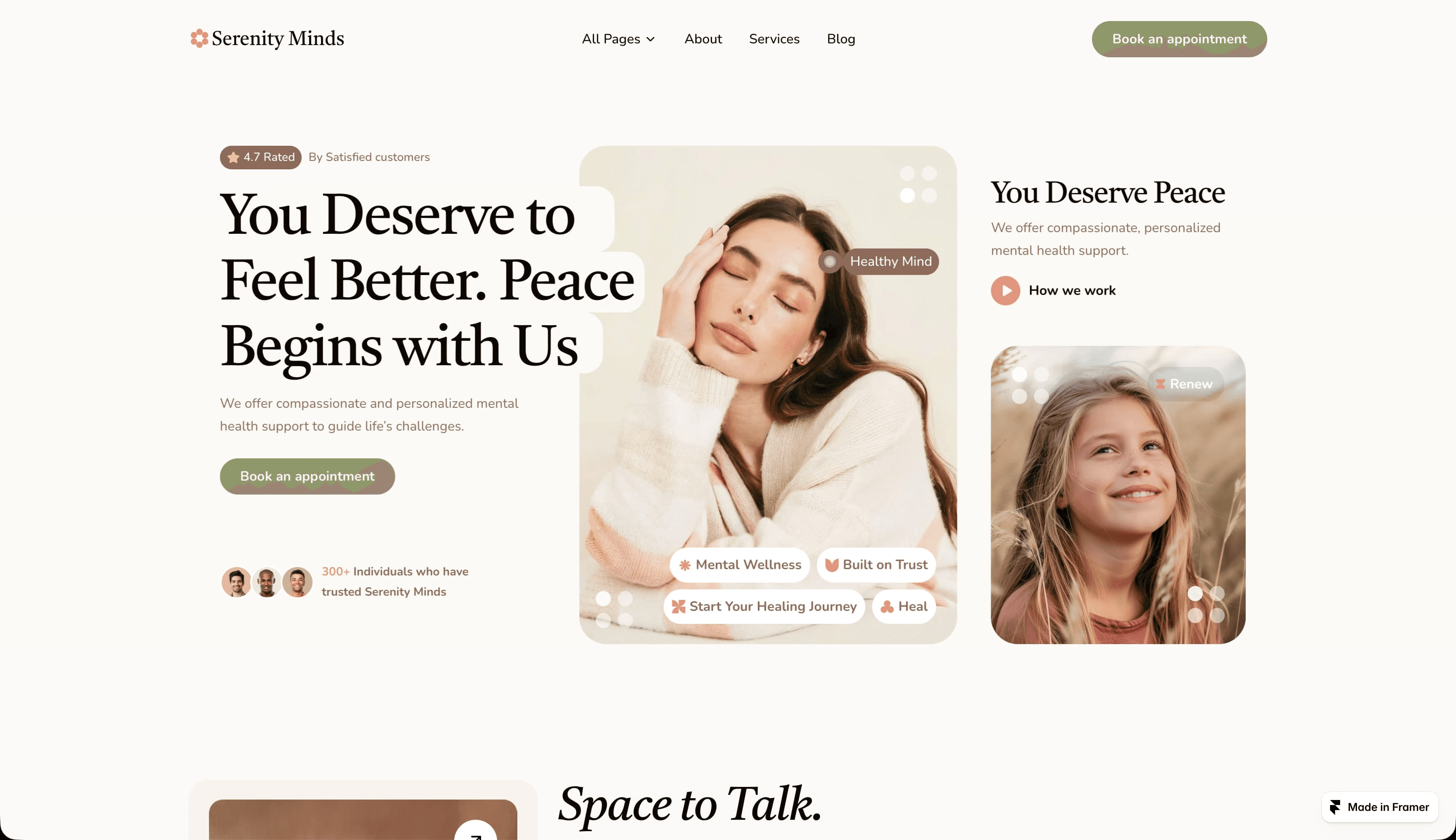在 Framer 的 Sereenity 模板中,温暖的大地色调营造出轻松平静的氛围。米色背景如同羊皮纸,而棕色则为正文提供了比黑色更柔和的替代选择。橄榄绿和赤陶色从常规的黑色字体中脱颖而出,引导用户点击行动号召(CTA)并探索网站。配合圆角和简洁的字体,这种配色既精致又平易近人。