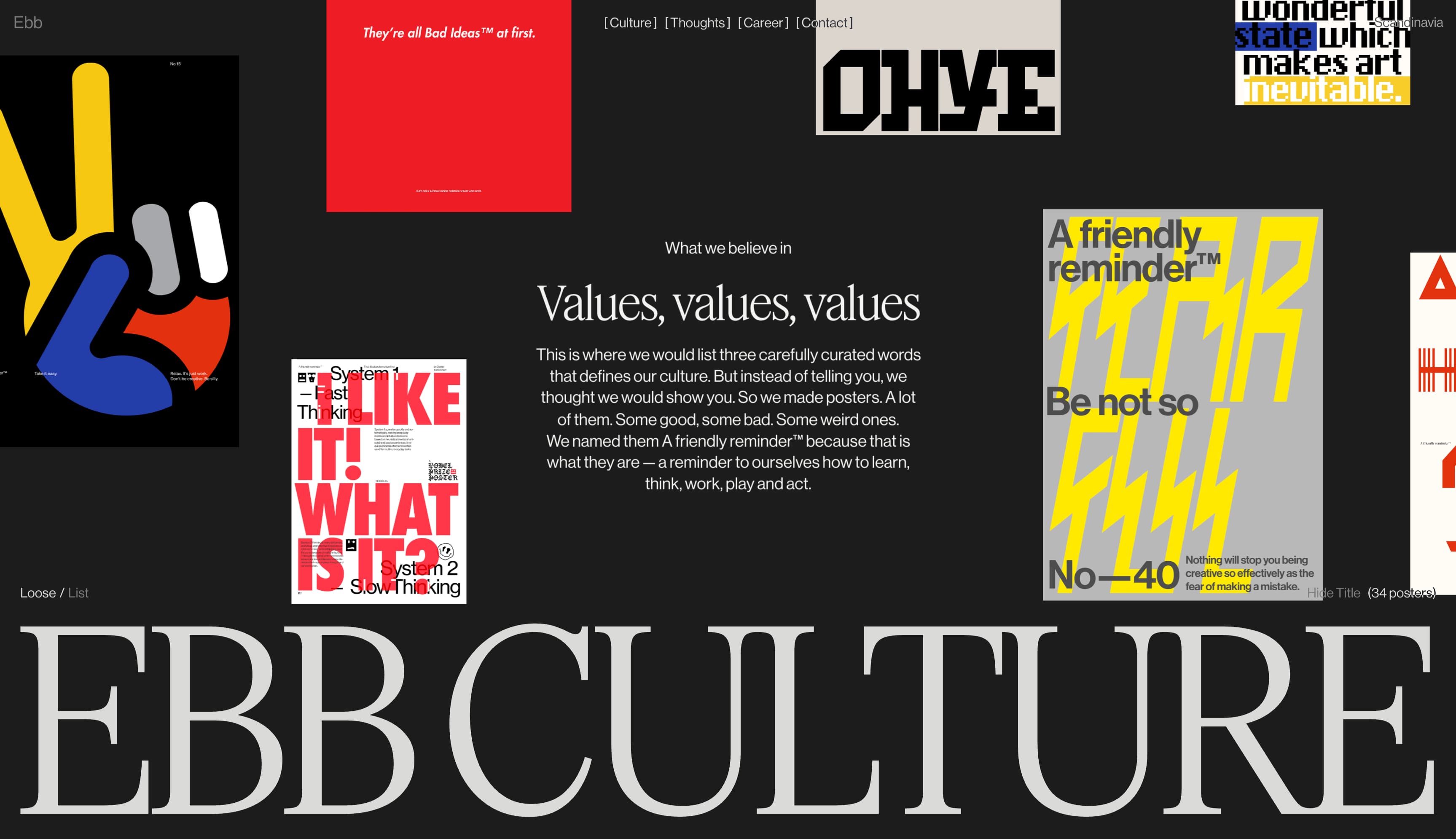 还有一个专门展示 Ebb 组织价值观的页面,他们用定制海报来诠释,强调对每项价值观的承诺。