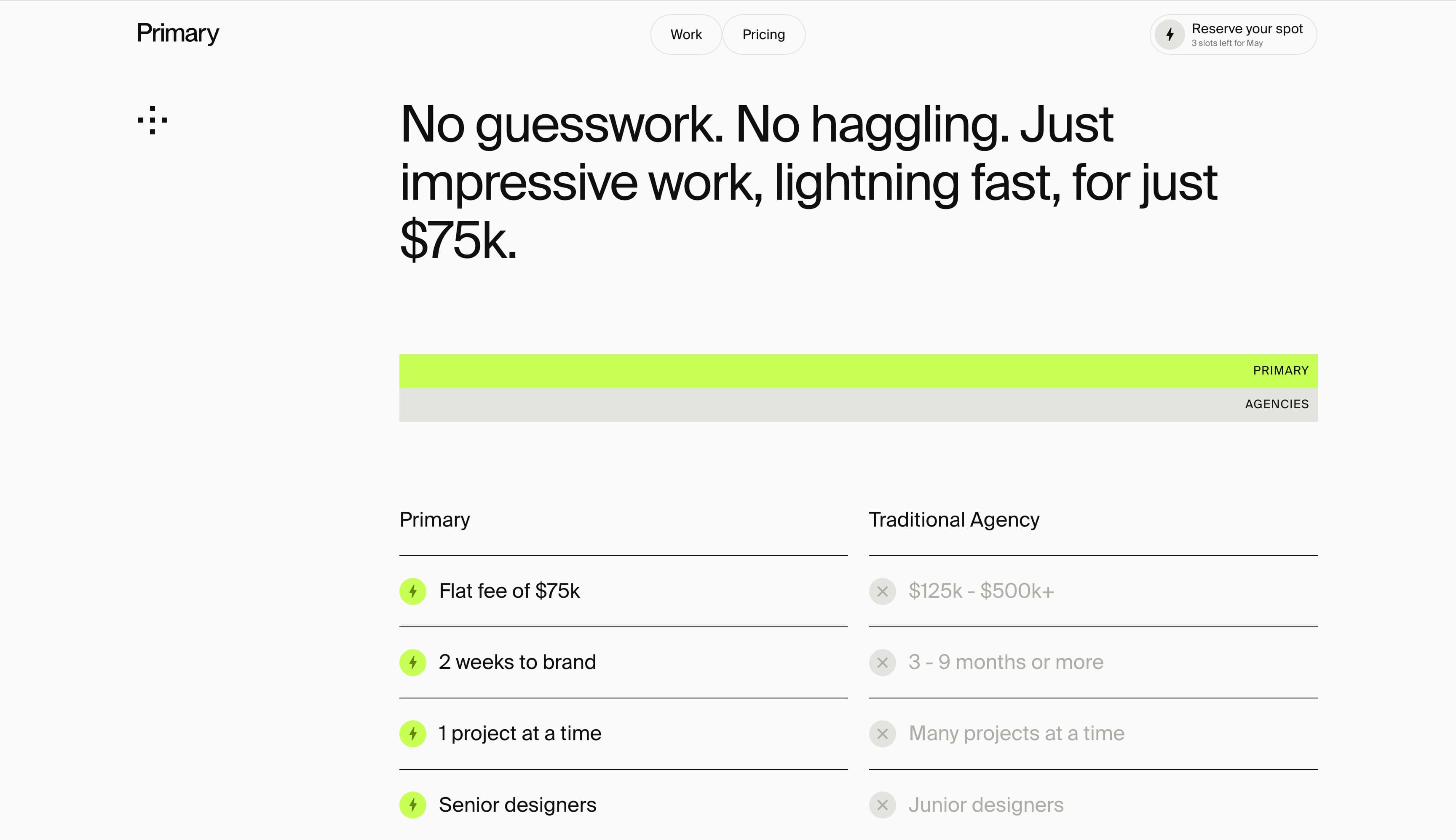 Primary Studio 将自己描述为"品牌冲刺机构",专注于引导小型创业公司实现快速增长。除了优雅的网站设计外,该工作室在定价透明度方面表现突出,清楚地展示 75,000 美元的固定费用,并在简洁的两栏表格中将其与传统机构定价进行对比。
