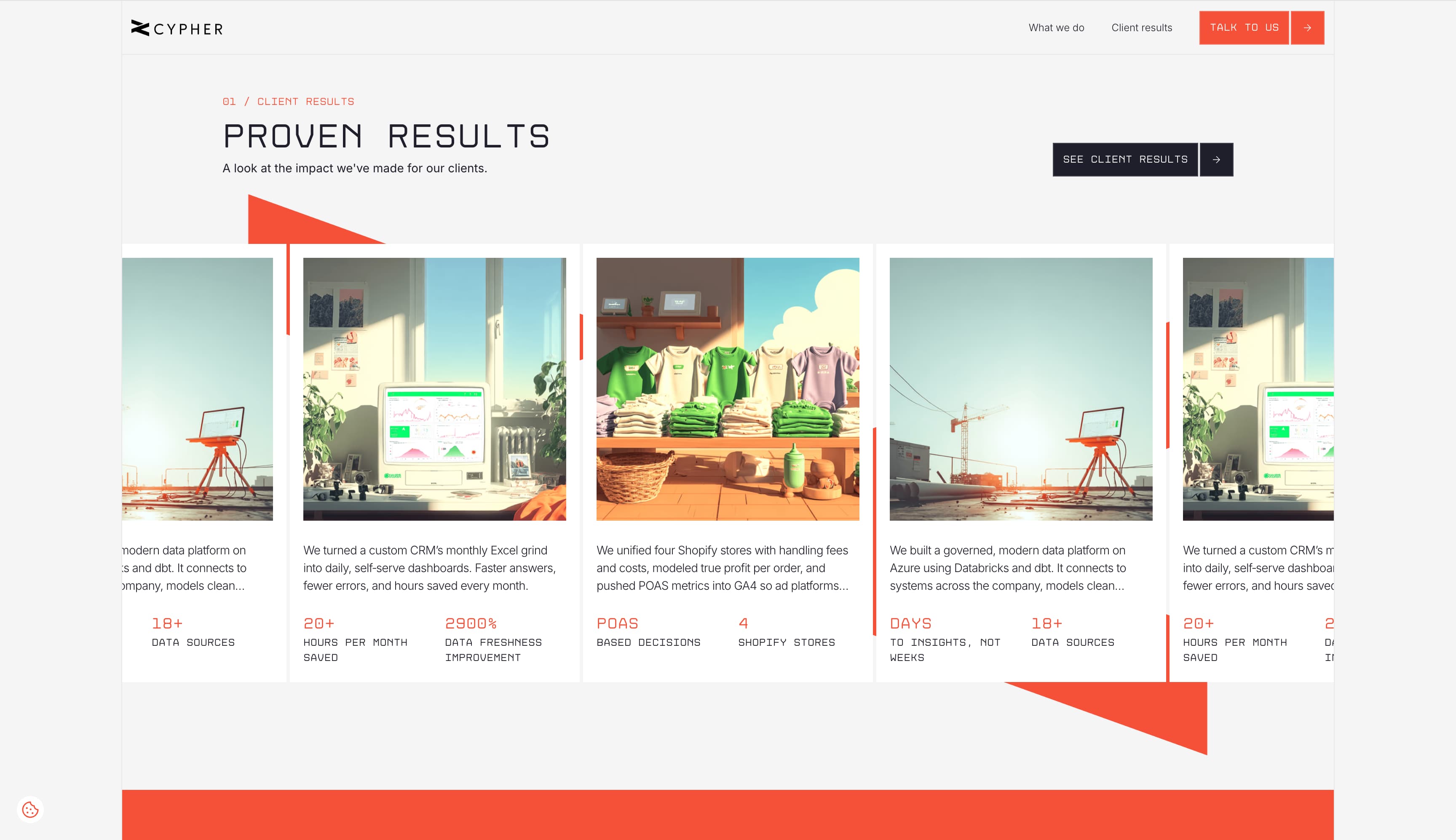 Cypher 专注于为直面消费者的企业构建分析解决方案。依托其在数据方面的专业能力,网站的案例研究卡片设计突出展示了成功项目的硬性指标。