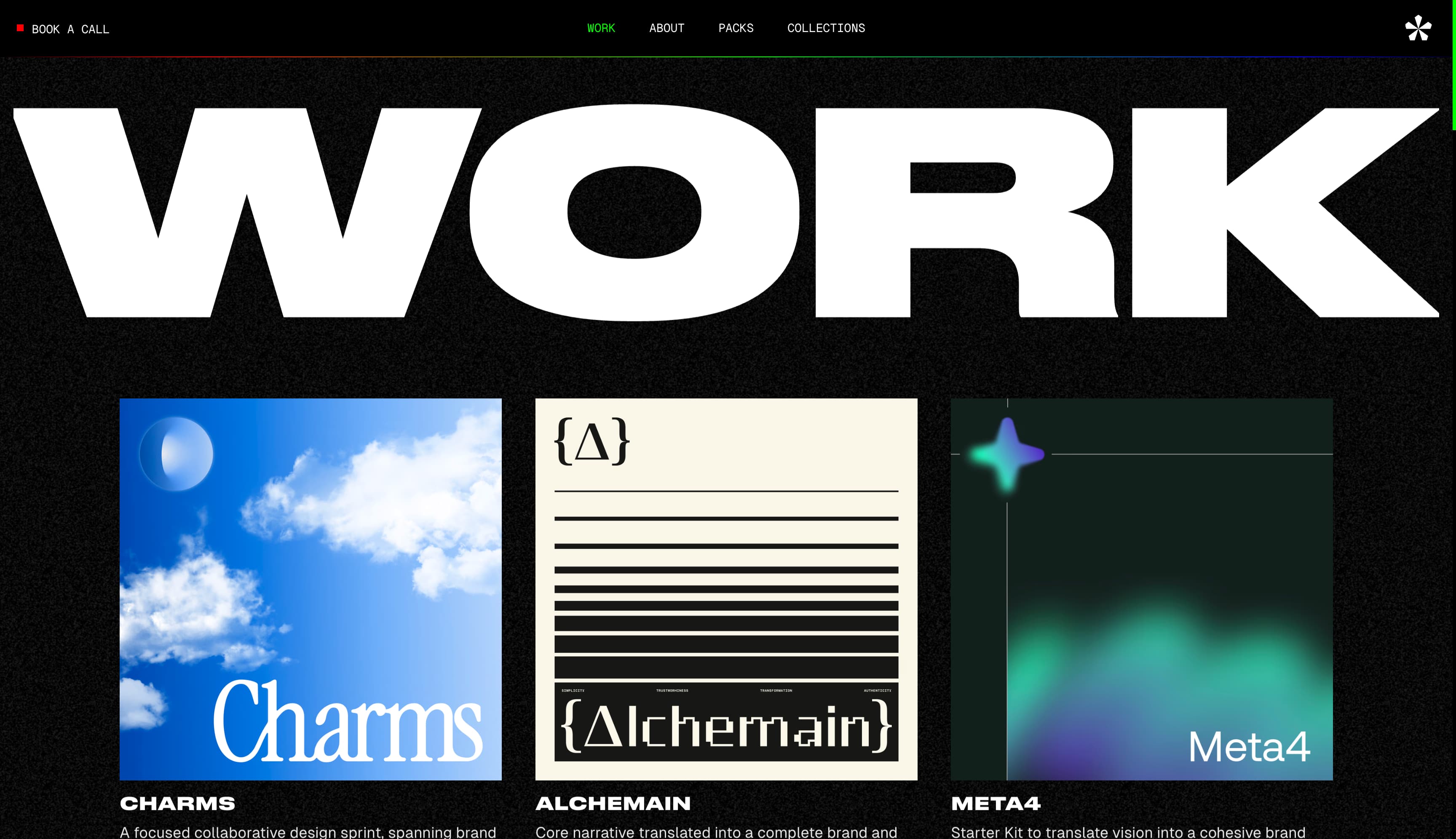 FLOC* 是一个数字品牌策略集体。其网站在纯黑背景上建立了四色调色板——绿色、蓝色、红色和白色。在视觉上,这与他们提供的四项核心服务相呼应:策略、品牌、数字产品和动态设计。
