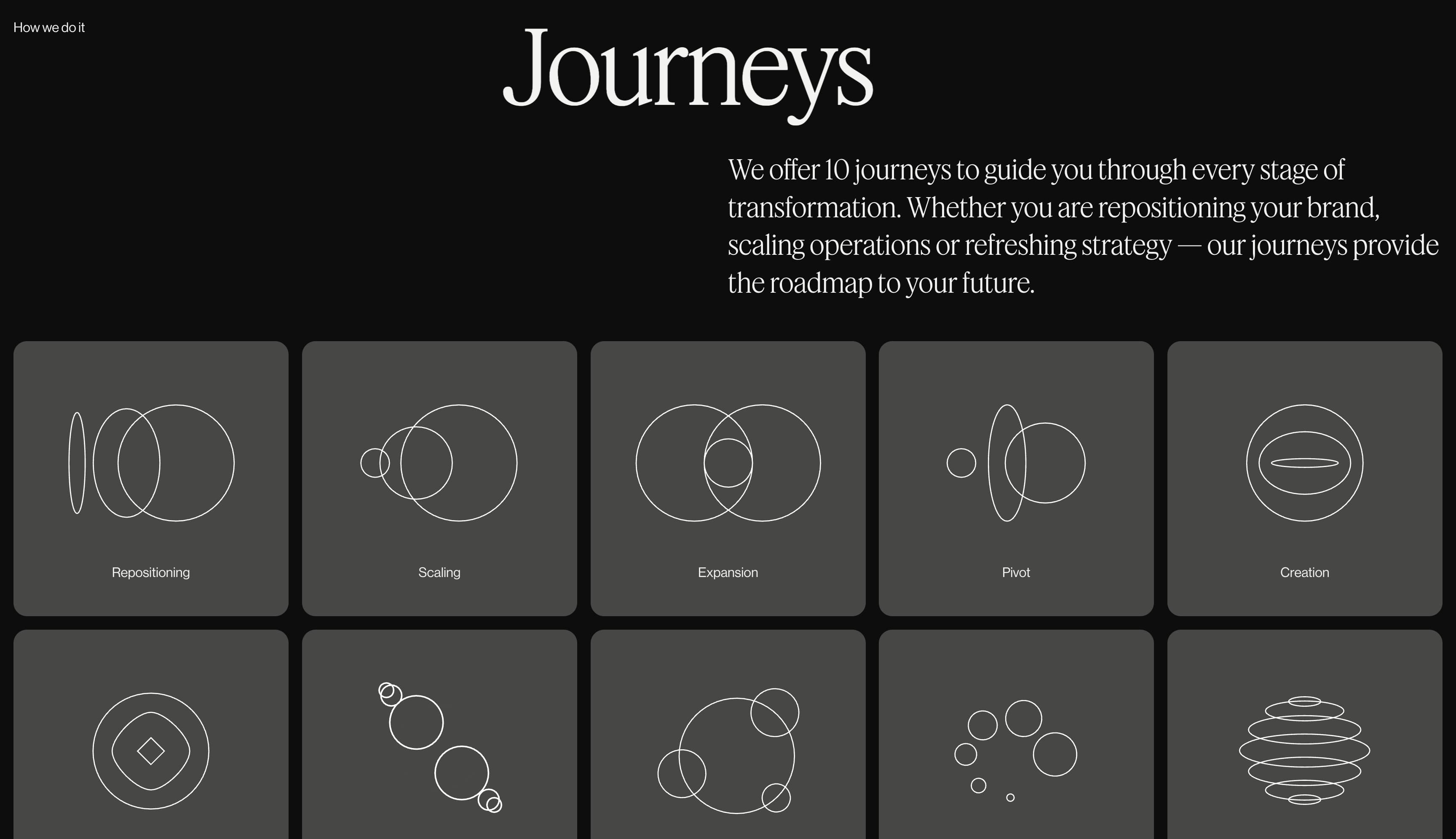 Ebb 是一家斯堪的纳维亚机构,将自己定位为转型工作室,将业务目标与创意努力相结合,帮助客户应对变化并取得持久成功。其主页介绍了工作室提供的十种不同"旅程",从"扩张"和"转向"到"转机",每条路径都通过自己的动画图形呈现。