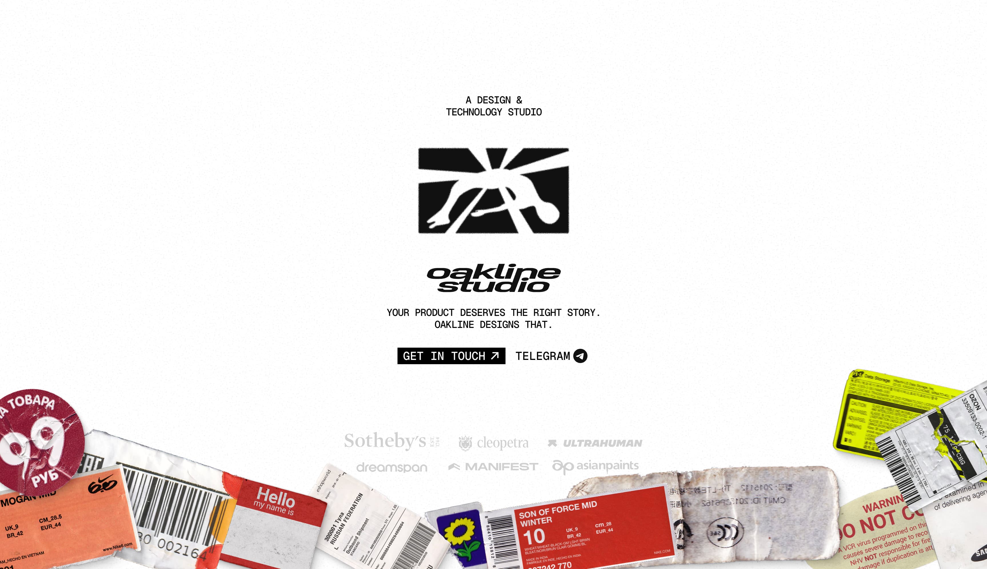 设计和技术工作室 Oakline Studio 采用极简、设计优先的主页,专注于强烈的贴纸视觉识别和清晰的定位。页面以醒目的标志、简短的标语和一小组行动号召开场,在不做过多解释的情况下定下基调。
