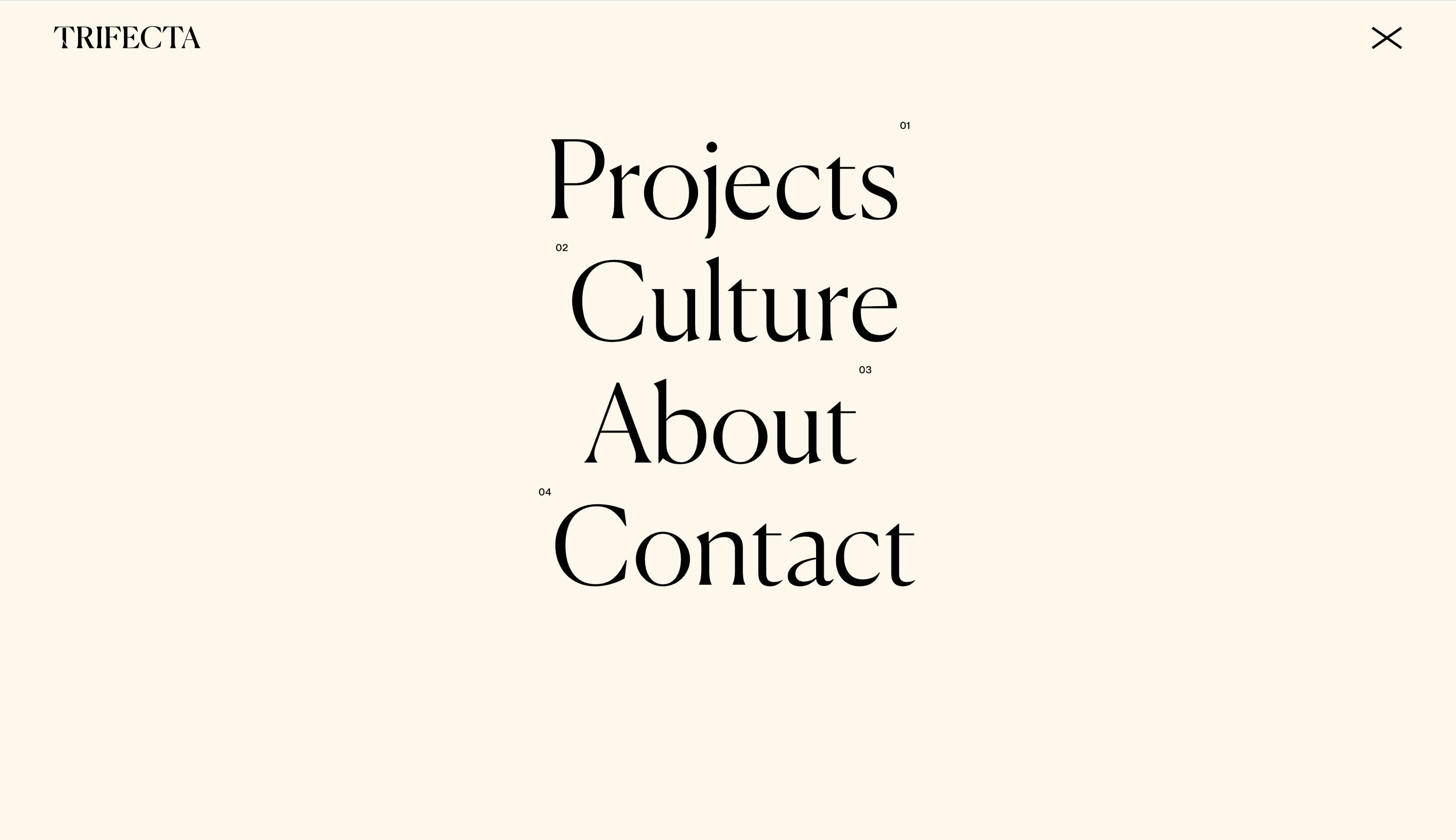 Trifecta 是一家位于纽约的精品增长工作室,通过"品味主导"的方法使自己脱颖而出。其网站以优雅的衬线字体和类似杂志目录的导航样式呈现这种编辑敏感性,强化了工作室精致的观点。