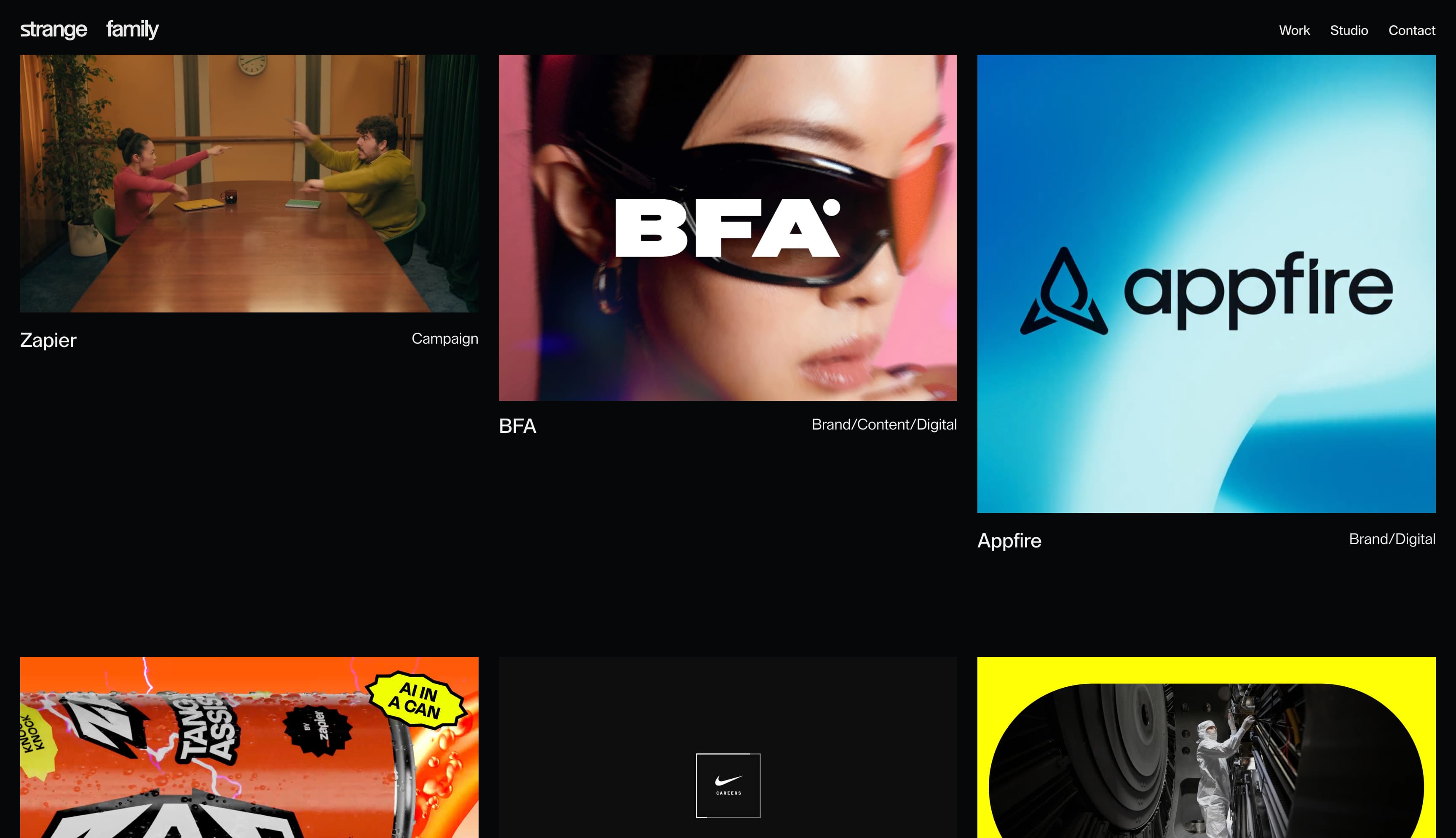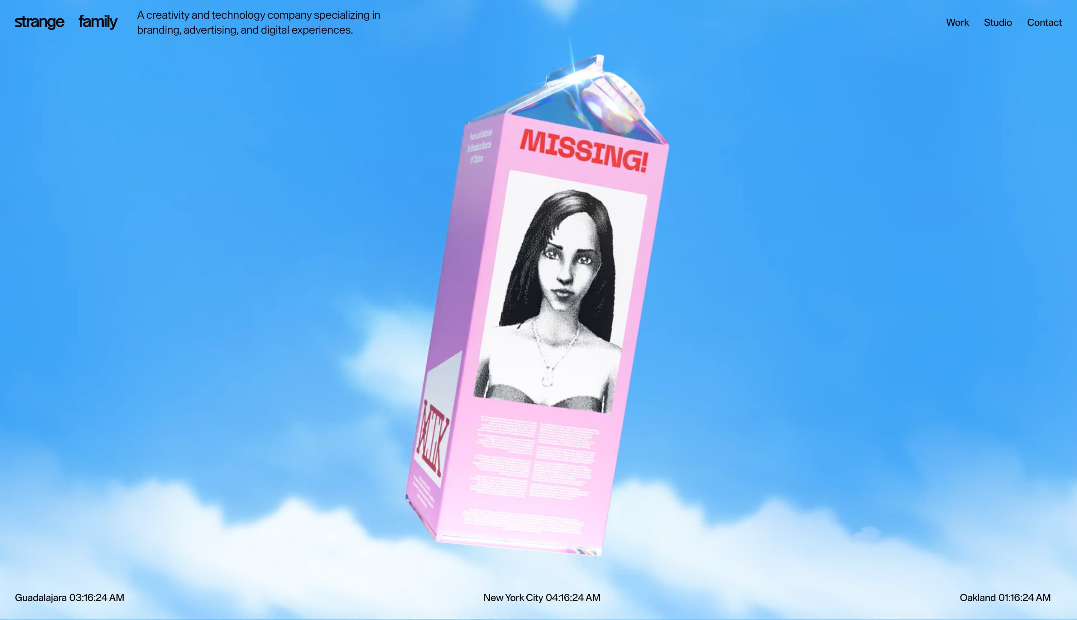 Strange Family 为寻求一站式品牌、广告和数字体验咨询机构的客户提供服务。其网站以一个引人注目的牛奶盒数字动画吸引访客,上面有"寻人"启事。这种超现实主义意象促使你点击以解读它,然后将你带到"作品"页面。这一策略表明 Strange Family 知道如何捕捉访客注意力并创造参与度。