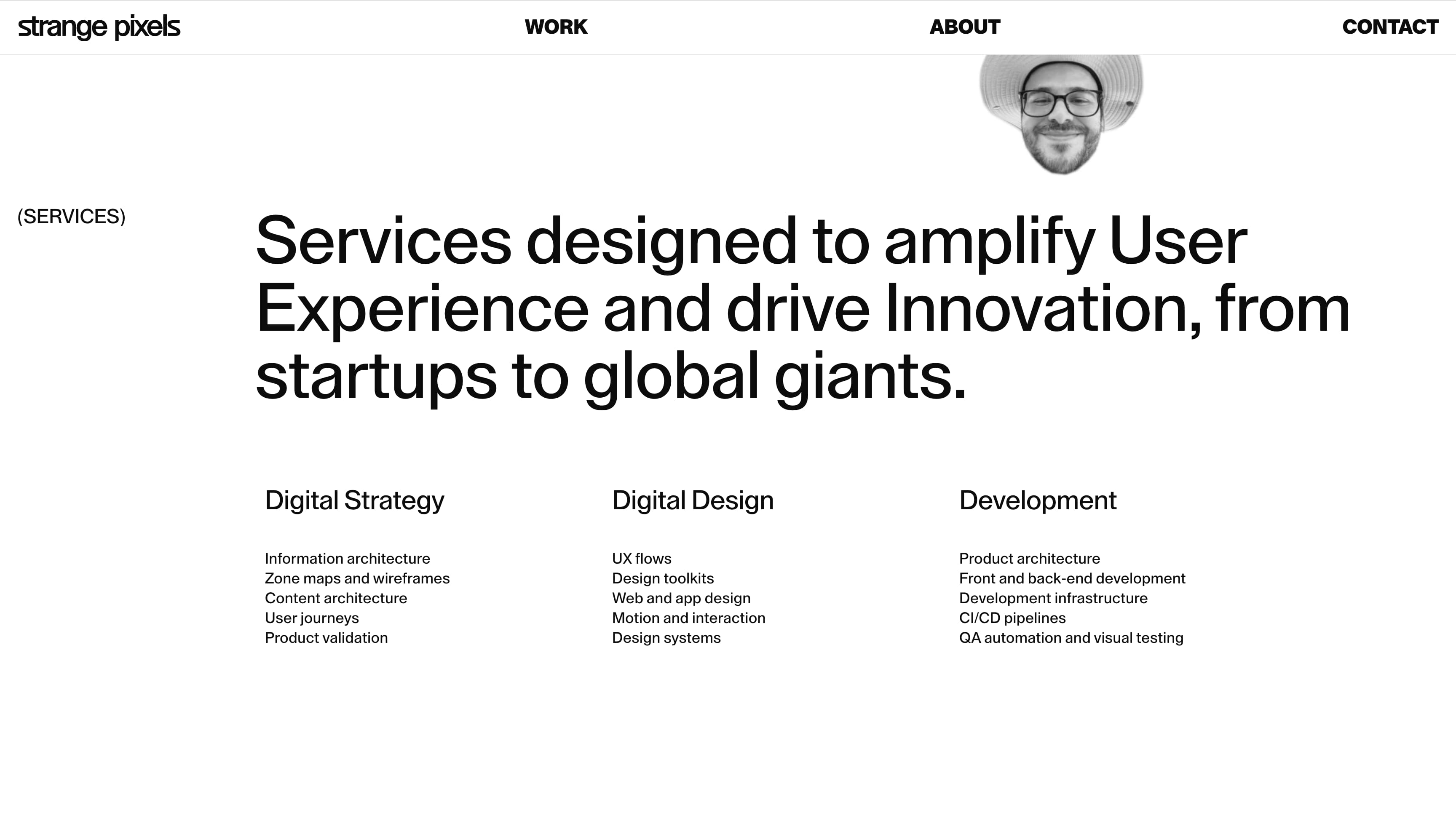 从这里开始,网站深入介绍具体服务,分为数字策略、数字设计和开发三大类别。每项服务都清晰列出,呈现方式便于快速浏览,帮助访客迅速了解工作室的能力范围以及这些服务如何应用于他们自己的项目。