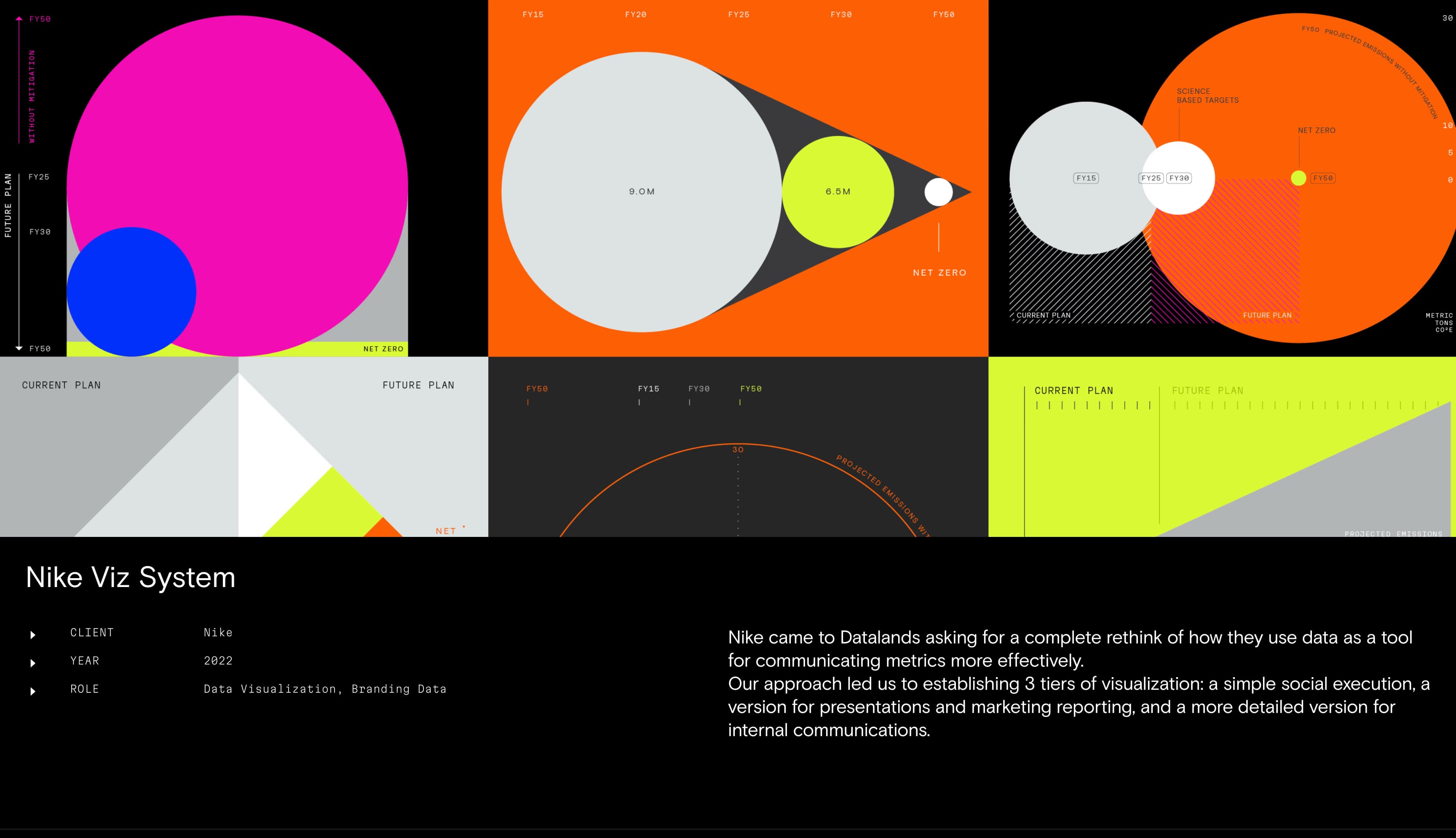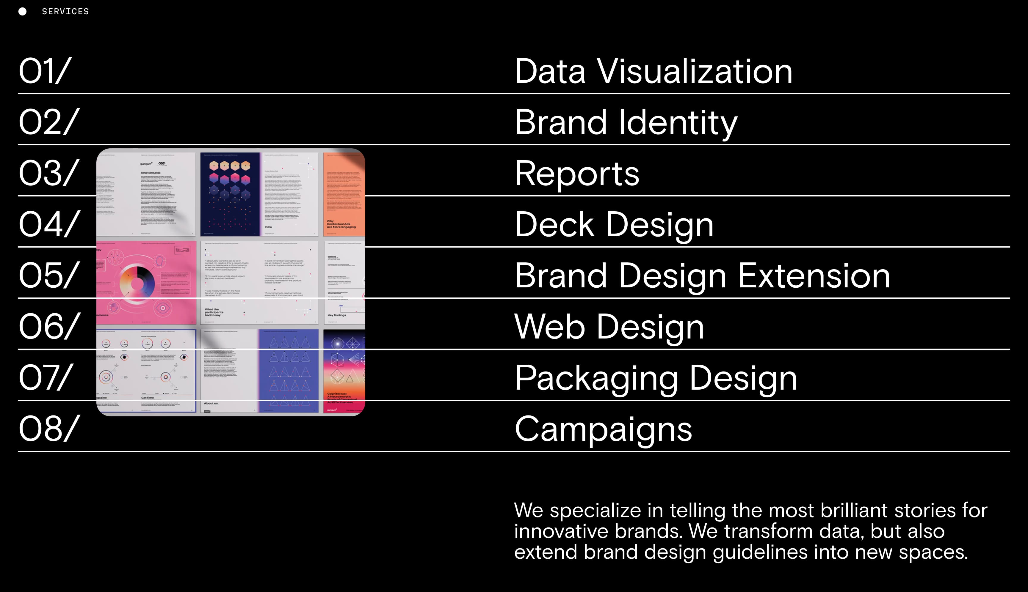 作为一家独立设计和品牌工作室,Datalands 专注于将复杂概念转化为引人入胜的叙事和直观的设计。他们高度互动的网站展示了工作室的能力。例如,将鼠标悬停在标有"数据可视化"的菜单项上会触发数据图形弹出。
