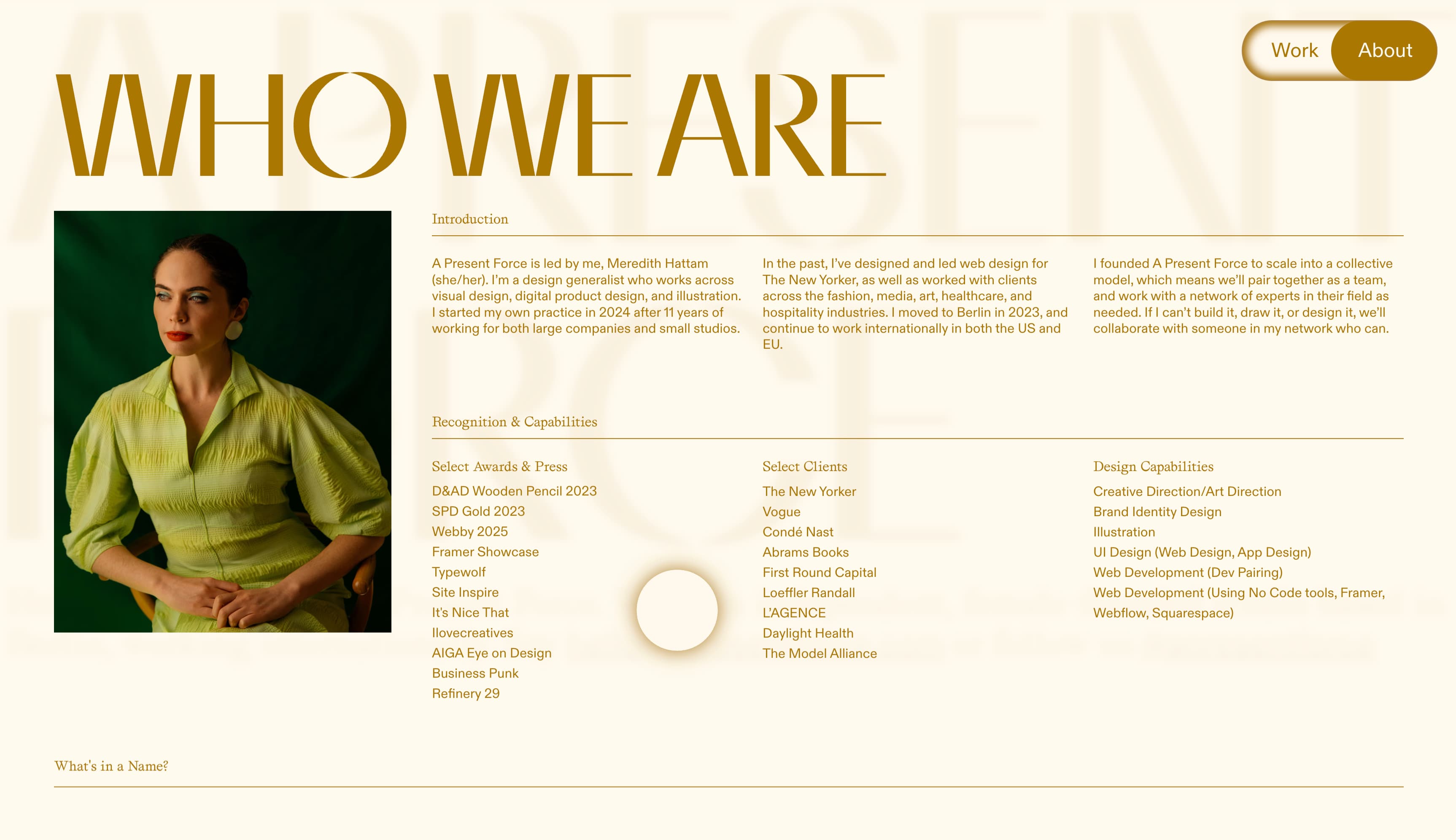 当用户点击"关于"标签时,配色方案会发生变化,在描述创始人 Meredith Hattam 的文字中呈现青铜色调,她现在从柏林领导 A Present Force。