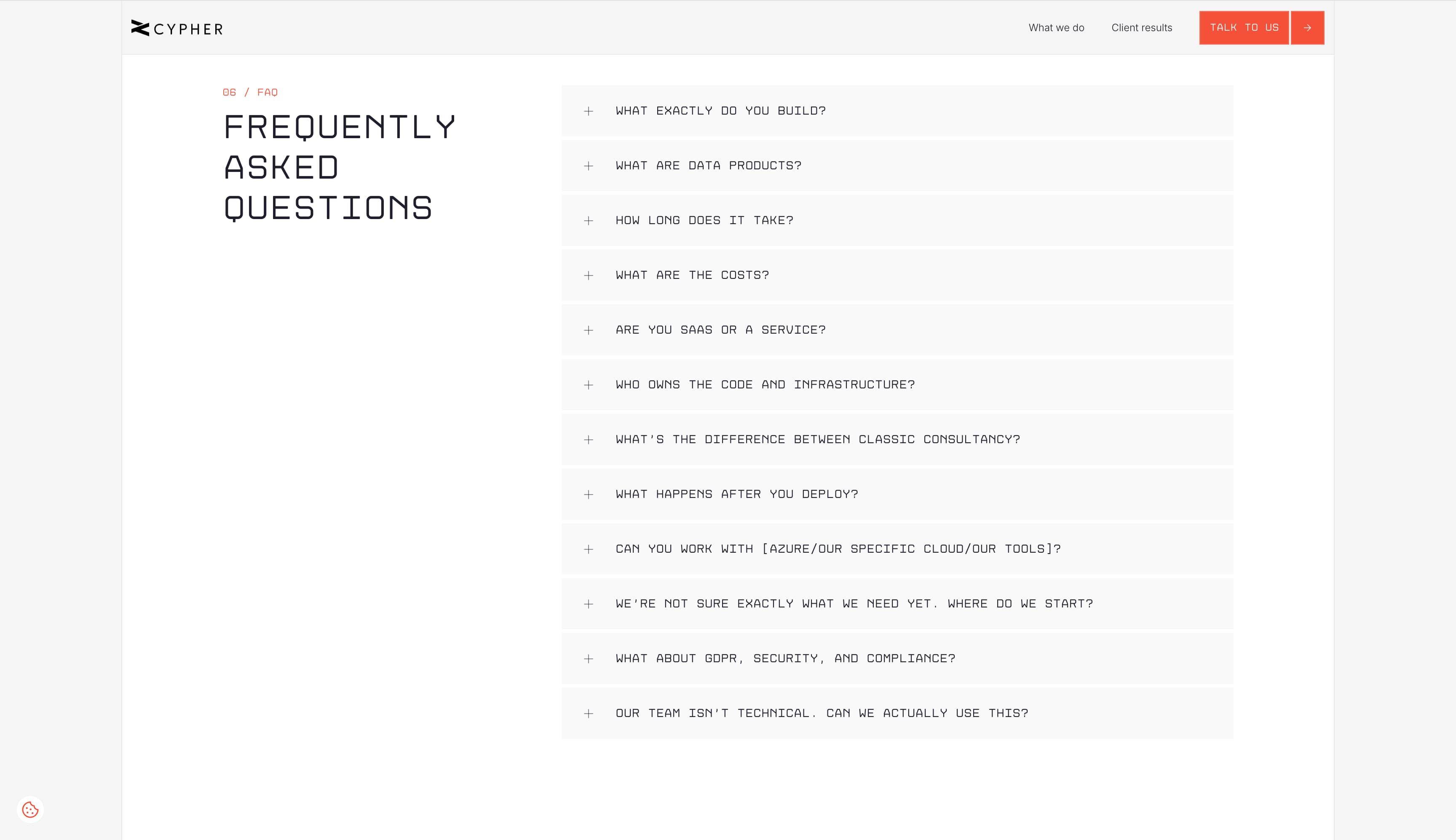 即使是 Cypher 的常见问题页面也采用像素化字体设计,巧妙地传达出计算机和数据是其服务核心的信息。