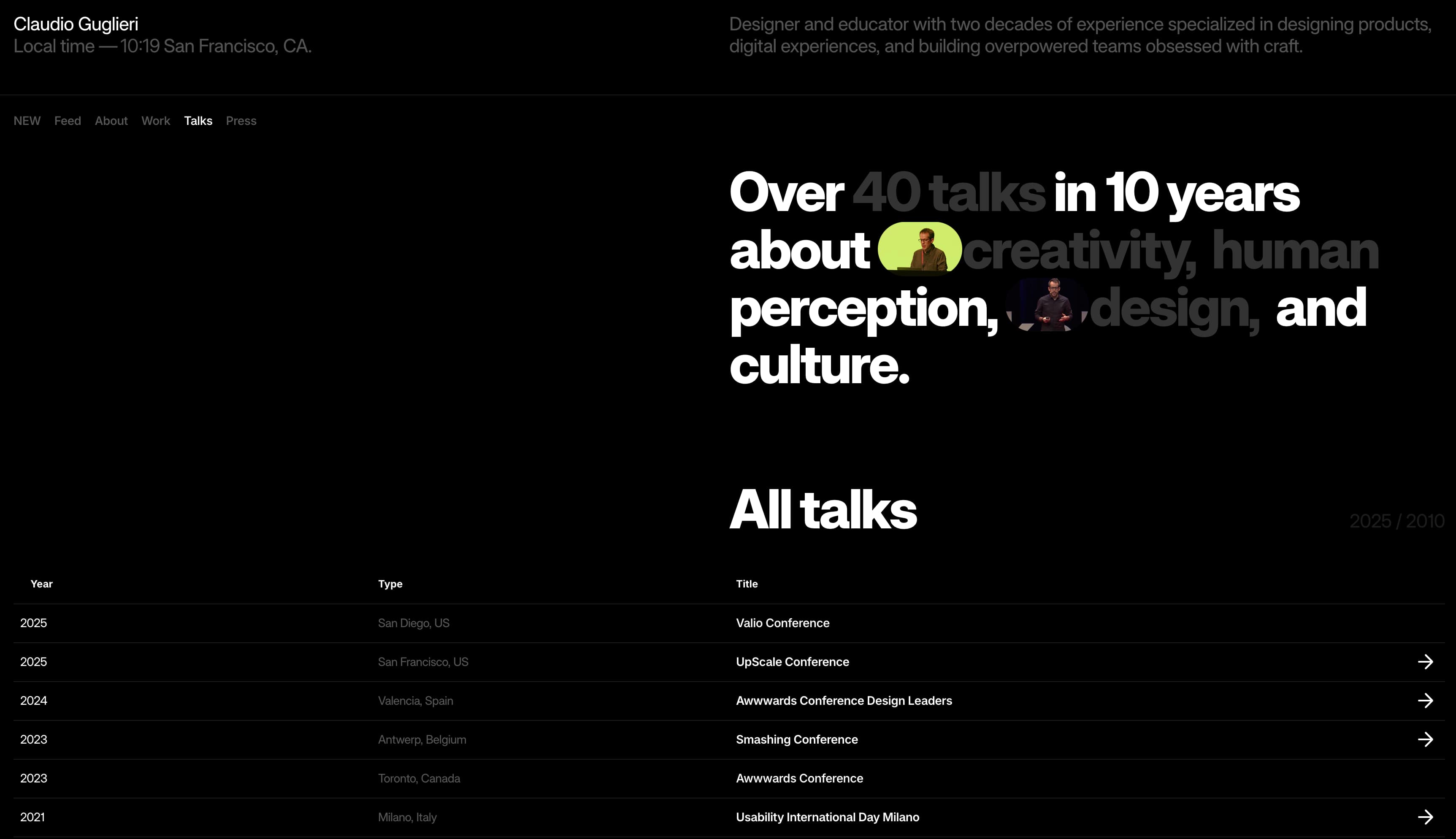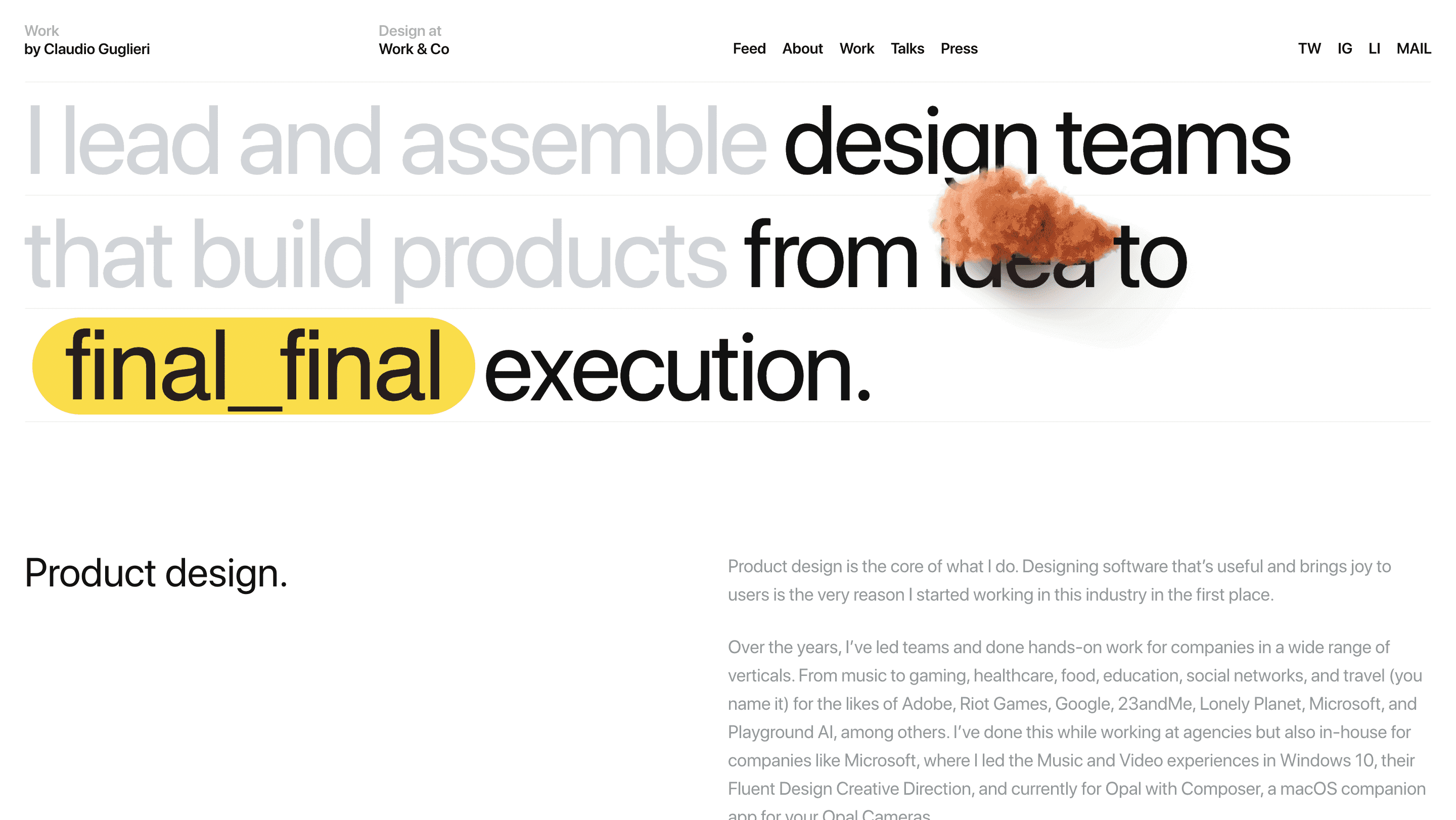 作为独立从业者,Claudio Guglieri 使用他的网站来阐述作为顾问和团队领导者的理念。该网站将过往作品作为未来成功的模板。Claudio 使用标题和文本块来介绍自己、解释他的方法并突出他的成功。