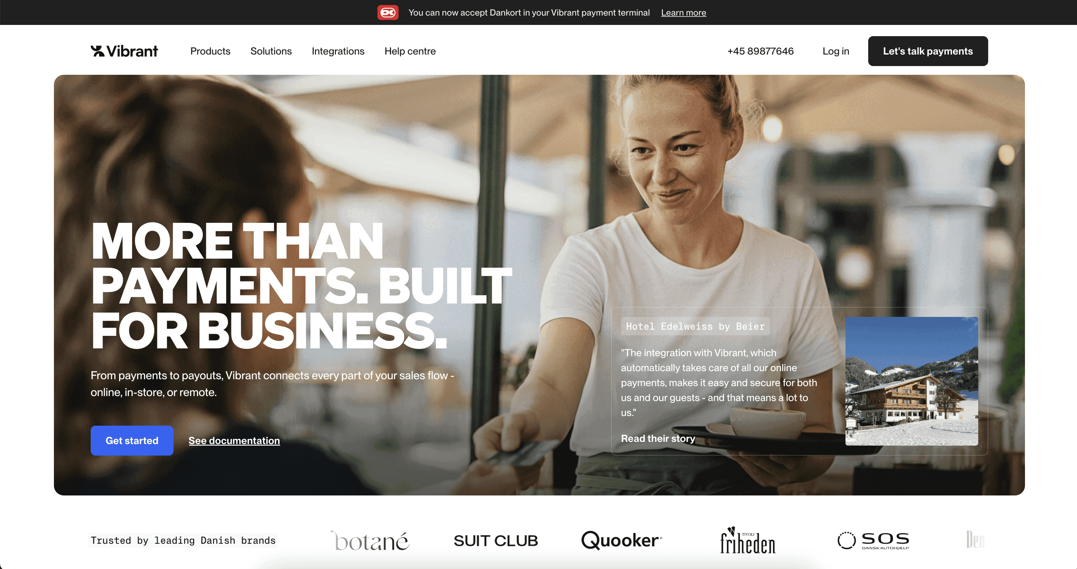 Vibrant是丹麦的一个在线支付平台,将店内和在线支付处理整合到一个系统中。其网站利用滚动触发动画创建视觉趣味——用流行的奶油黄色填充空白空间——从而创建了一个自然的区域分隔线。一个基本的推荐网格通过多样的客户声音提供社会认同,而精美的产品截图和 GIF 展示了软件在实际使用场景中的应用。