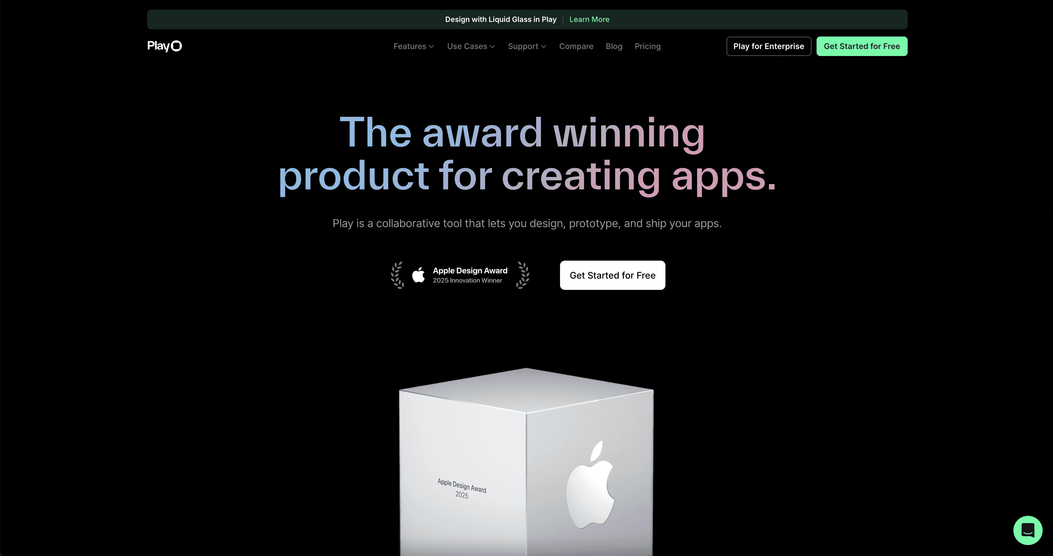 Play——一个协作设计工具,使团队能够设计和发布 iOS 移动应用程序——通过首屏展示其 Apple 设计奖来突出其外部信誉。该网站的带选项卡的界面嵌入了 GIF,为展示其自由形式设计画布、原型制作功能、Apple App Clip 共享和 Play 到 Xcode 发布功能创建了一个有组织的容器。