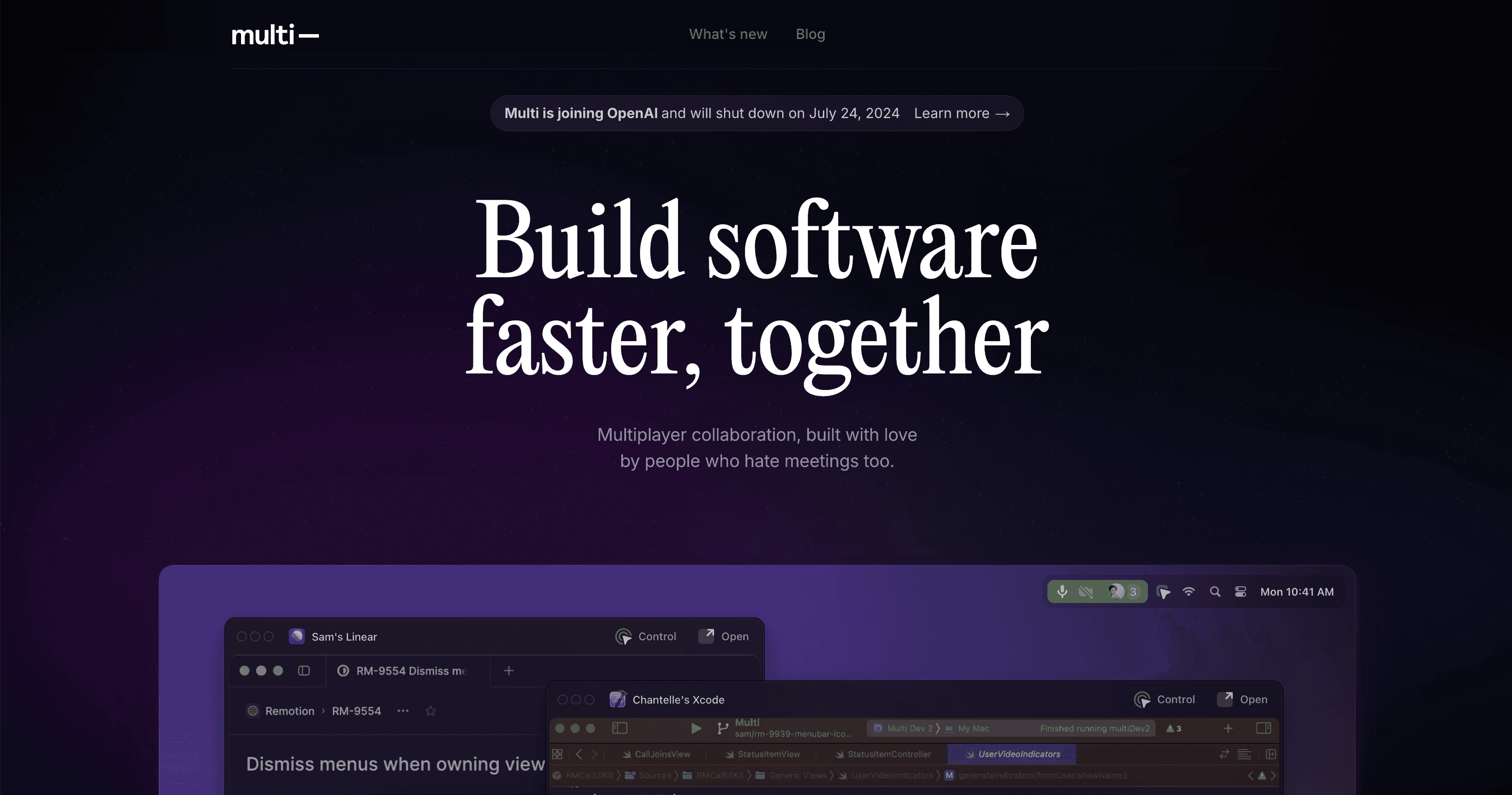 在2024年被OpenAI 收购之前,Multi是一个用于 macOS 的多人协作平台,旨在实现实时屏幕共享和 AI 驱动的会议文档。其网站采用了深色配色方案,吸引了开发人员受众,同时通过对比元素突出显示了关键功能。一个突出的特点是交互式屏幕共享演示,带有移动光标,突出了平台的协作功能。