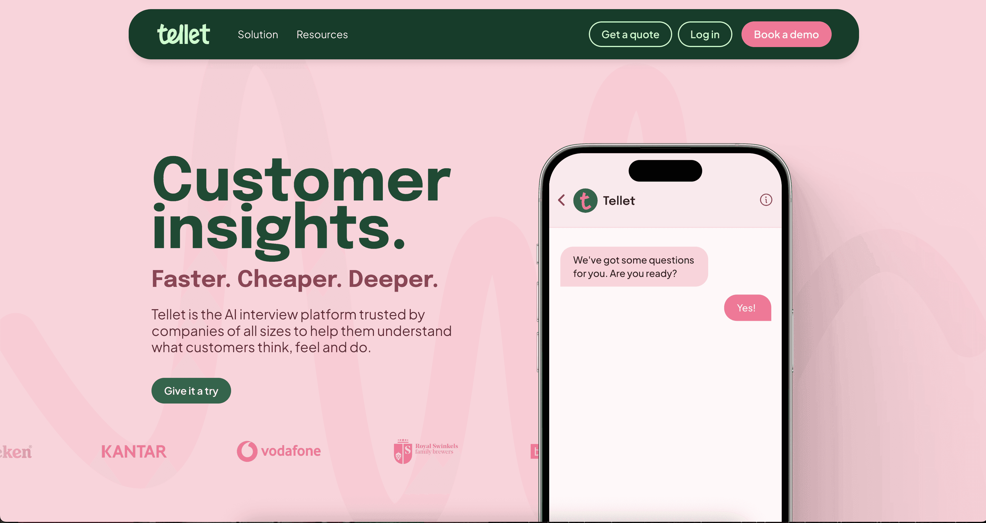 总部位于阿姆斯特丹的 Tellet 是一个客户研究平台,通过 AI 驱动的对话进行用户访谈。凭借其独特的粉绿色调色板,Tellet的网站使用滚动触发动画,逐步显示示例用户访谈(以及这些对话中得出的产品洞察)的界面截图,随着用户向下浏览页面而显现。