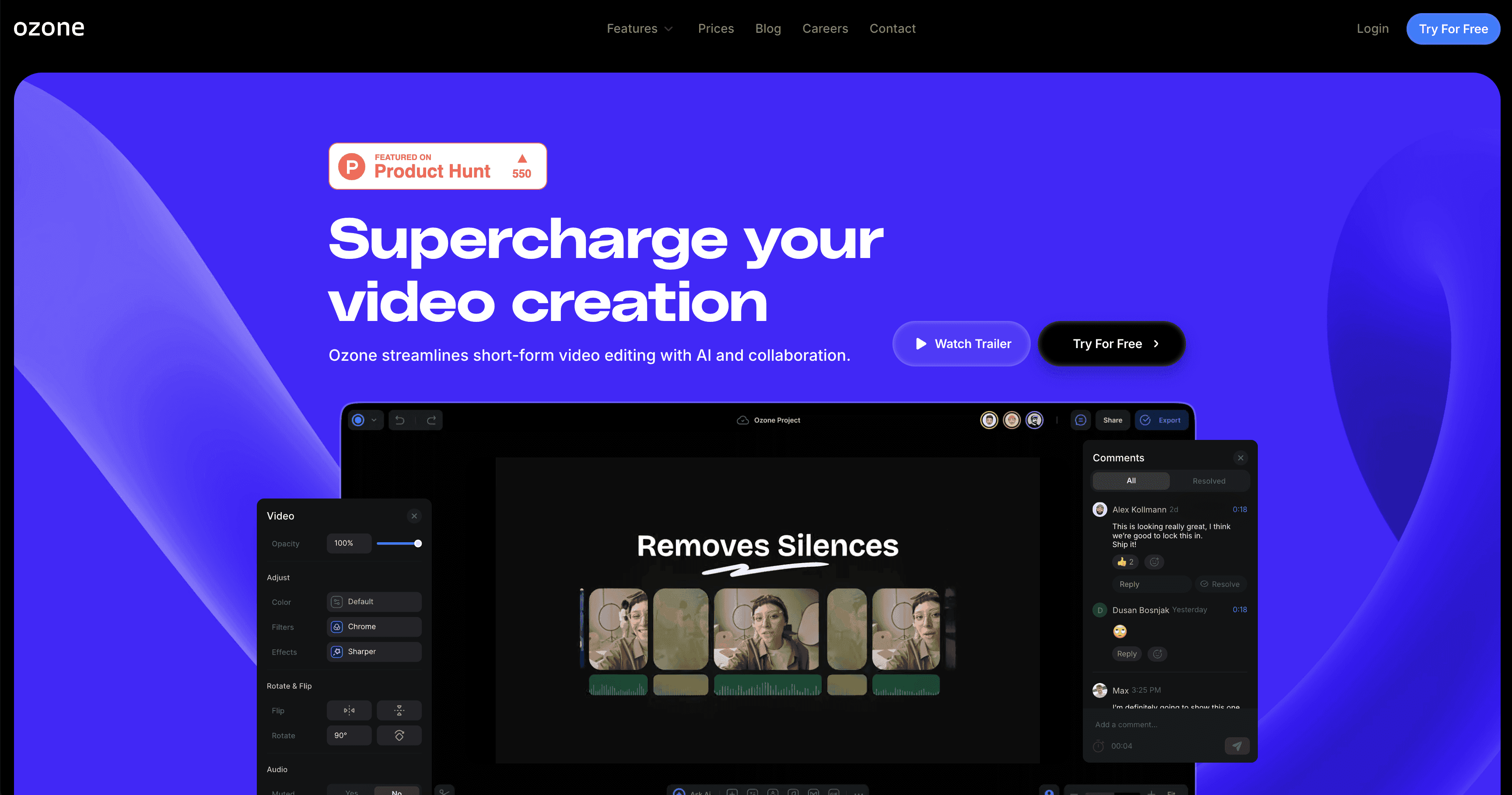 作为一个由人工智能驱动的云端视频编辑平台,Ozone的网站使用黑色背景和醒目的紫色与蓝色点缀来突出其创意界面。该网站的特色是模仿其软件界面的框架,并展示了实时聊天等协作功能,描绘了一些编辑滑块,并突出了其可拖动的时间线视图。基于卡片的布局通过 GIF、截图和描述的组合有效地组织了功能。一个超大的“免费试用”CTA 和粘性导航栏创造了强大的转化点。