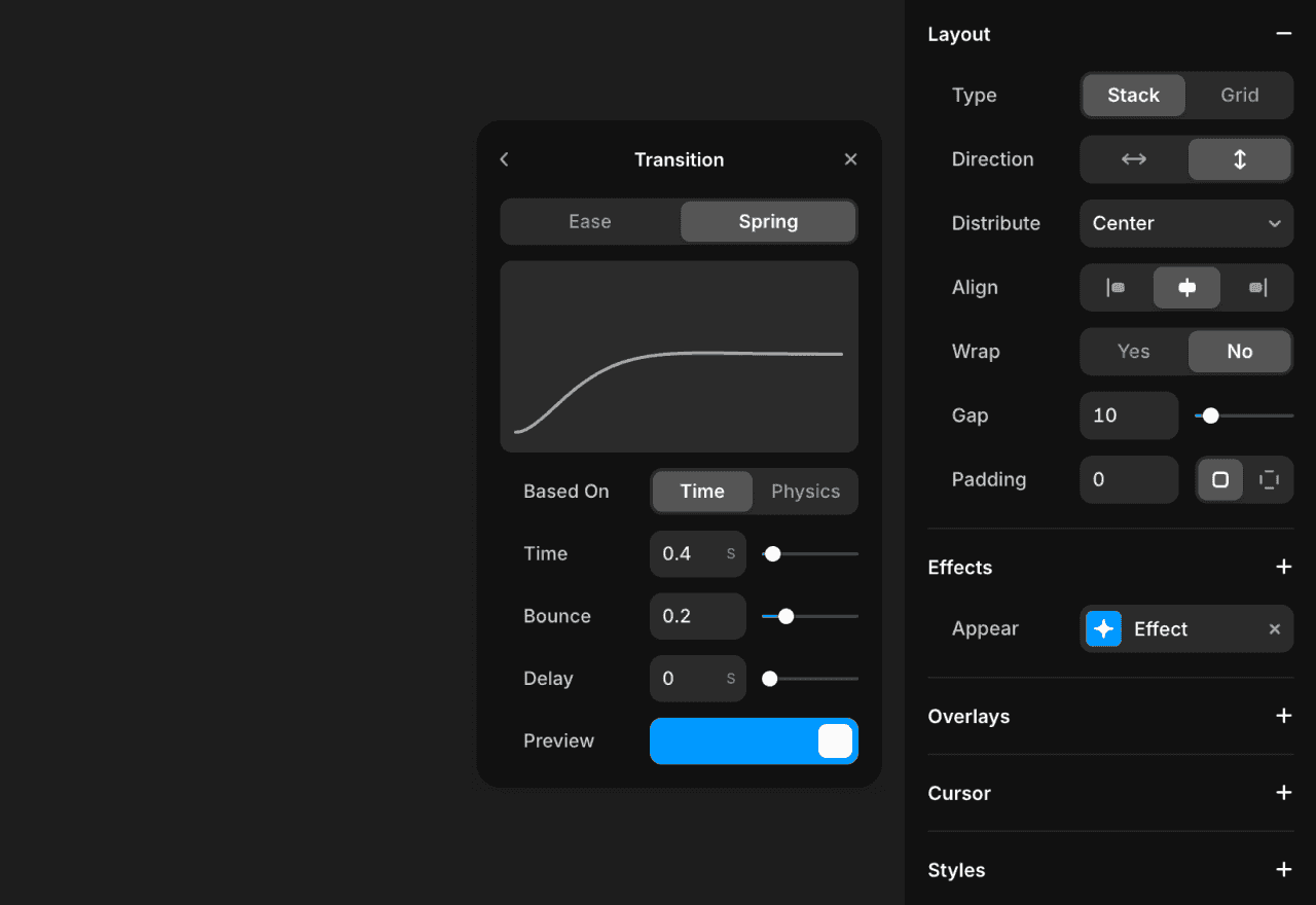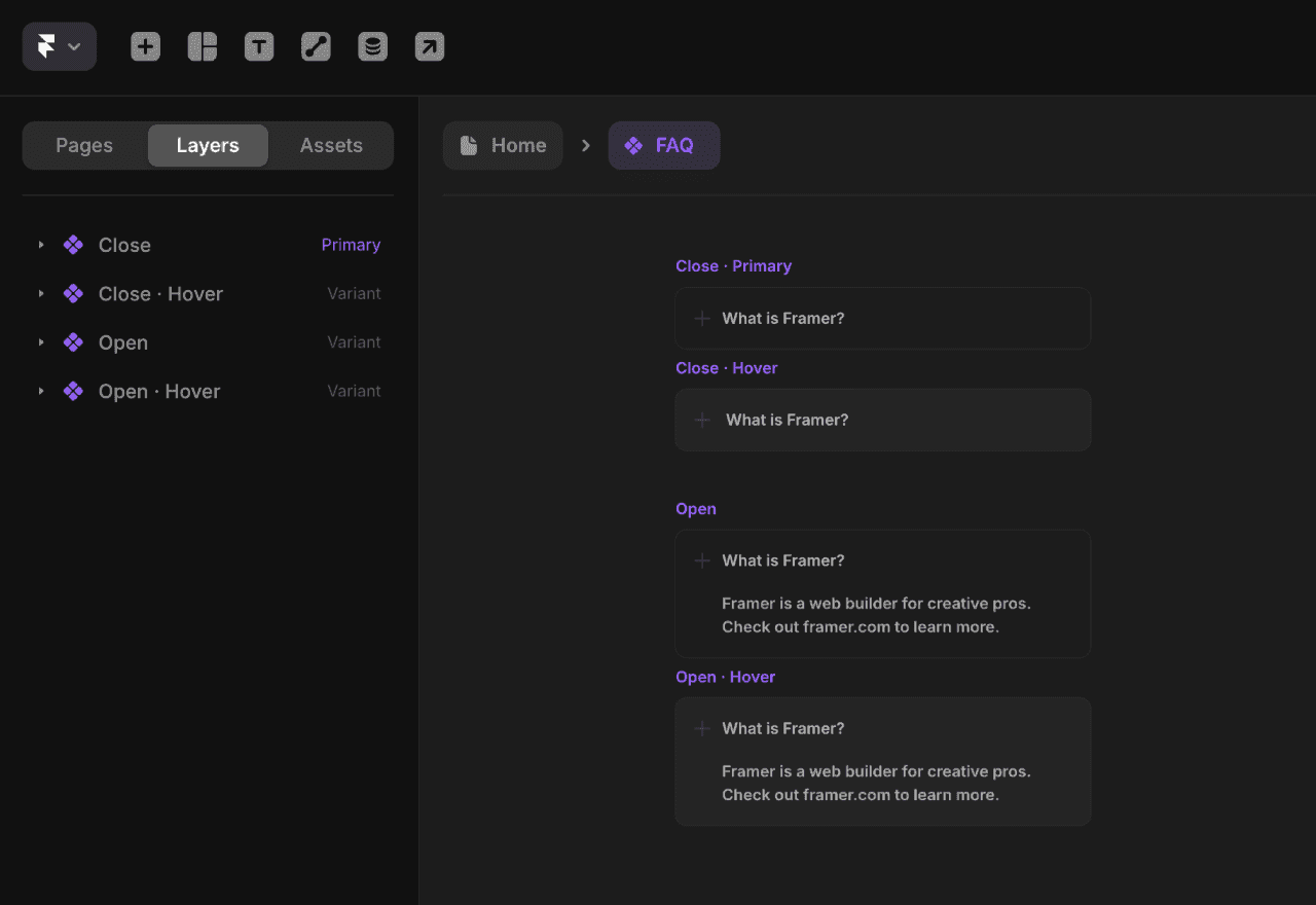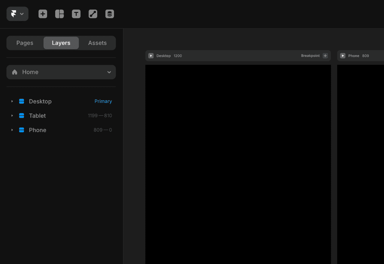 像 Framer 这样的无代码设计师工具,通过响应式字体大小和基于堆栈的设计,使设计适应不同屏幕尺寸变得简单,这些设计可以流畅地响应可用空间。你可以在一个编辑窗口中查看所有断点适应的设计,从而轻松添加和删除元素以改善每种体验。通过断点继承,你对主断点所做的任何更改都将自动“级联”到其他断点。