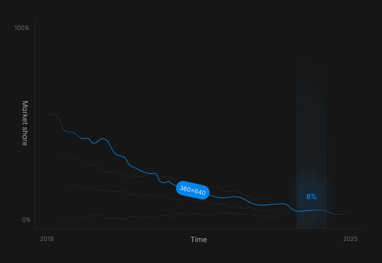 2018 年,最常见的显示分辨率 (360x640) 被 23% 的用户使用。现在,没有任何一个单一分辨率的市场份额超过 8%。