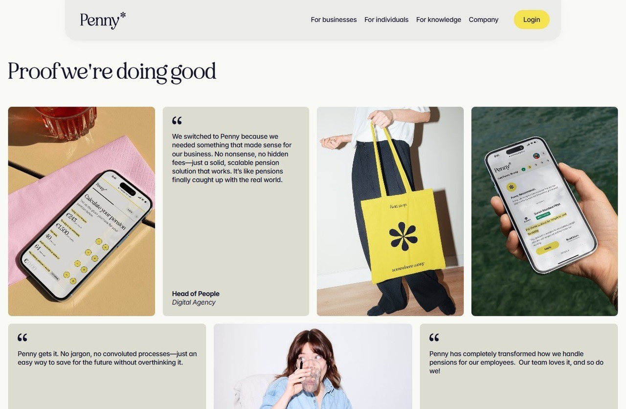 Penny,一个专为女性设计的养老金解决方案,通过将详细的客户故事放在页面的底部,紧邻最终的 CTA,做到恰当的时机,让社会认同感觉自然而非强迫。在此之前,他们展示了合作伙伴徽标以建立初步信任。