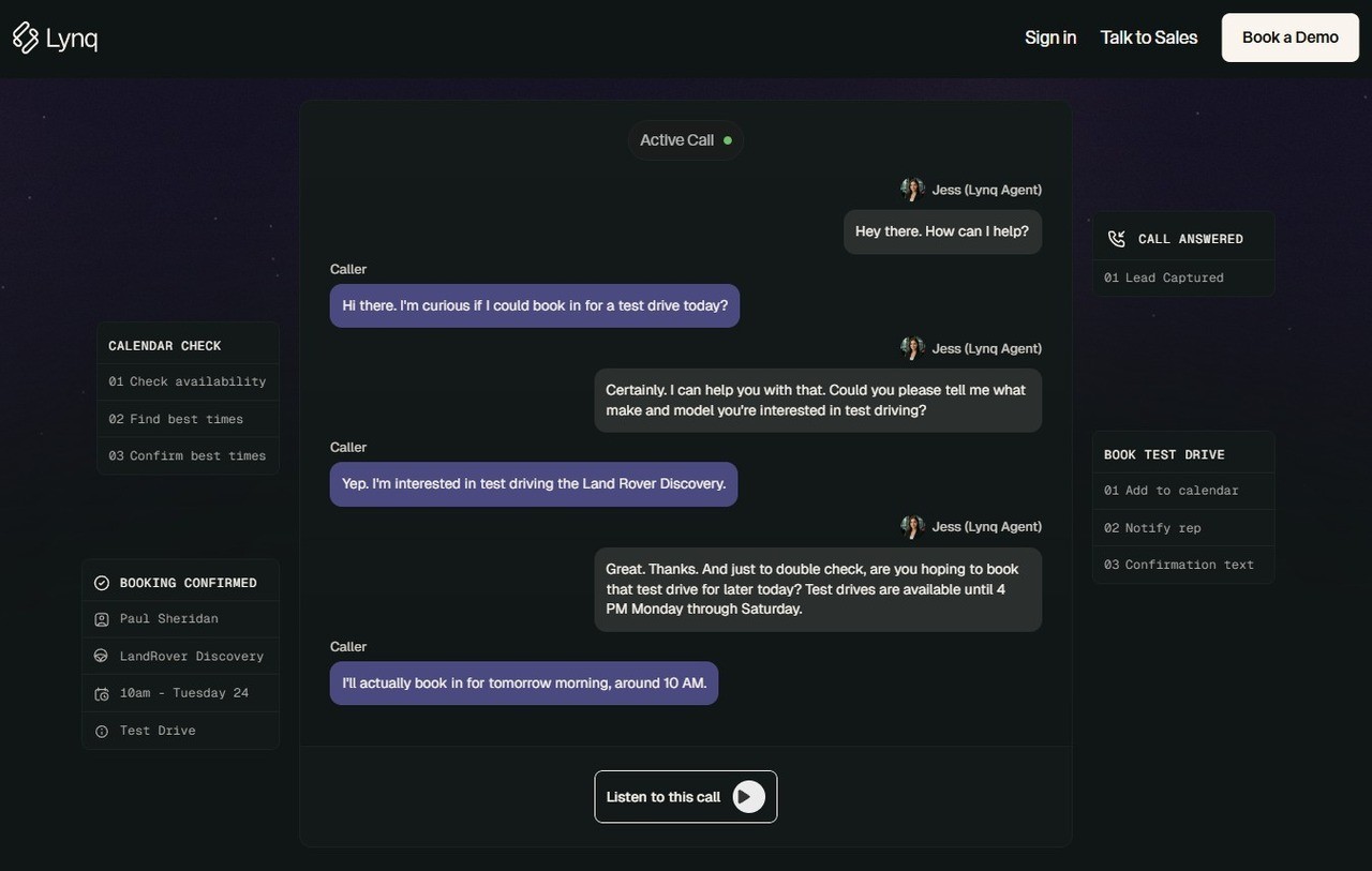 Lynq,一家为汽车经销商提供人工智能支持代理的平台,避免了在其着陆页上散布快乐购车者的库存照片。相反,访客会看到 Lynq 的平台界面和真实的对话记录,以及一个播放按钮,以便你可以实时跟随人工智能交互。你可以清晰地看到产品的功能,而不是抽象的客户满意度表示。