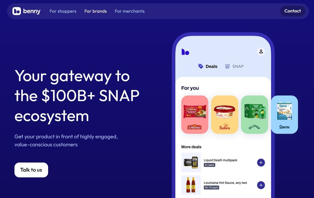 Benny,一个帮助人们获取政府福利的应用程序,为每个目标受众都有一个独立的着陆页。消费者会看到以福利为重点的宣传语(“通过 SNAP 获得现金返还”)和下载应用程序的邀请。品牌则会看到一个诱人的超过 1000 亿美元的市场机会以及与销售团队洽谈的邀请。商家则会看到完全不同的信息,向他们展示 API 如何轻松集成到他们的系统中。