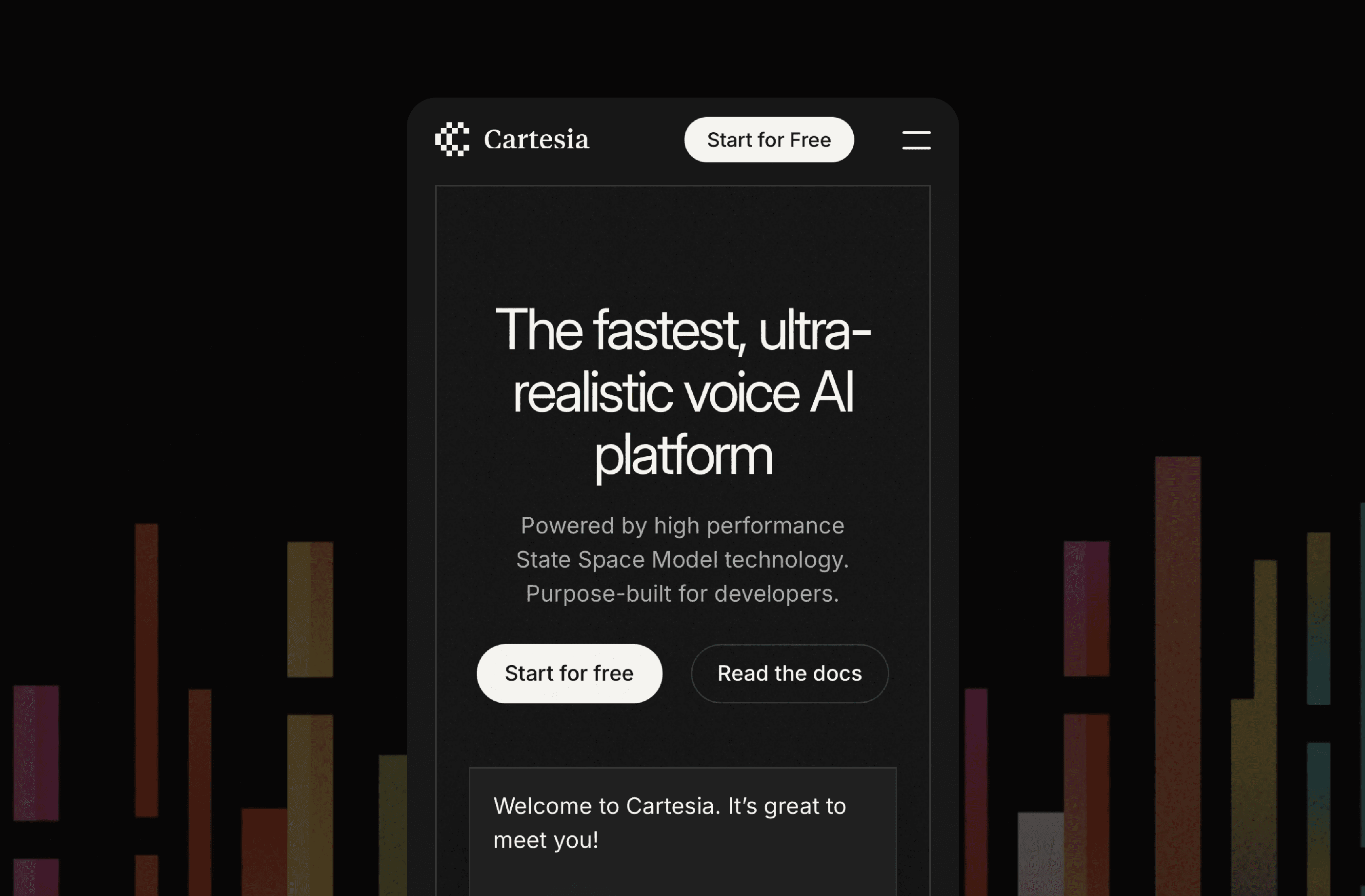 Cartesia,一个人工智能平台,在其网站的桌面版本上包含一个完整的菜单,但将其缩小为移动设备上的汉堡菜单和单个 CTA。由于“免费开始”CTA 被固定在一个粘性标题上,它始终可见、始终可访问,并且不可能被忽略。
