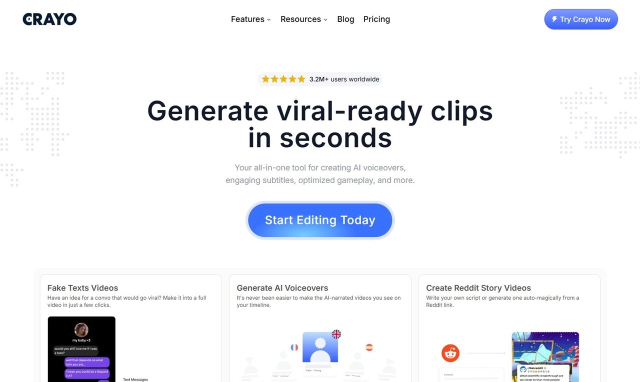 Crayo,一款AI视频编辑工具,实际展示了这一点。他们并非试图向你普及视频编辑知识或建立品牌知名度。他们页面上的一切都旨在推动你立即制作第一个视频。