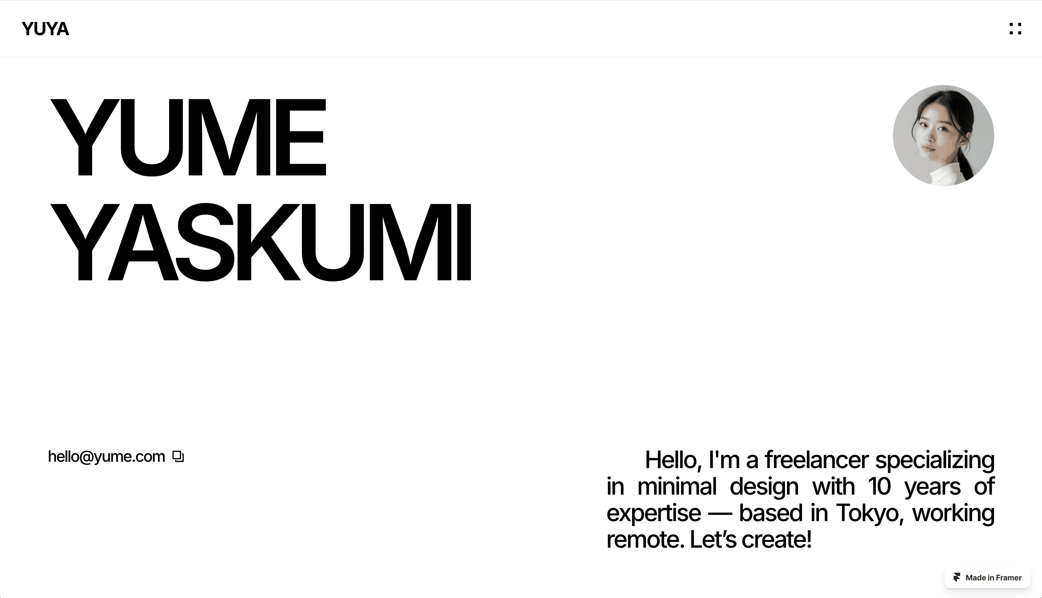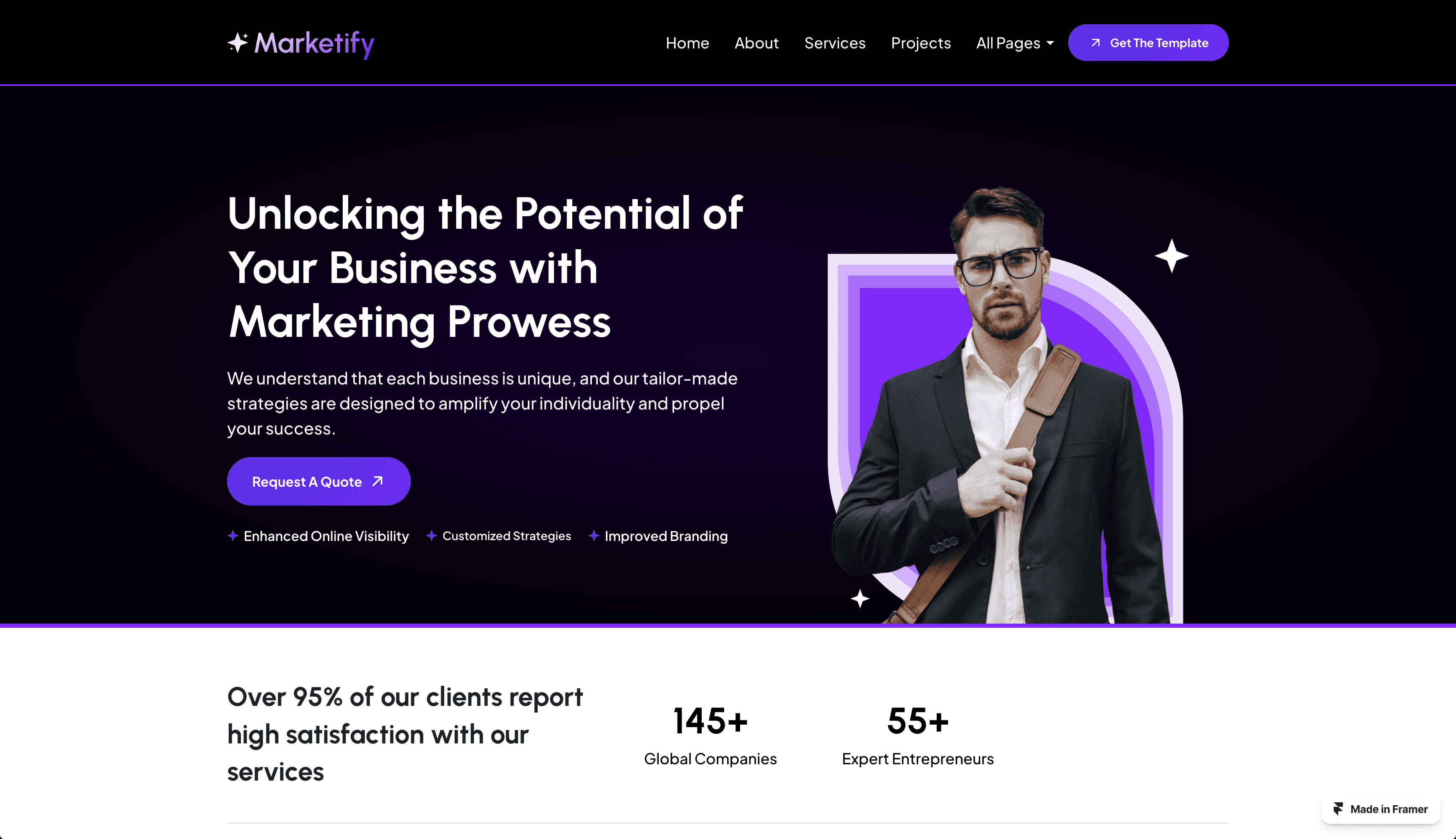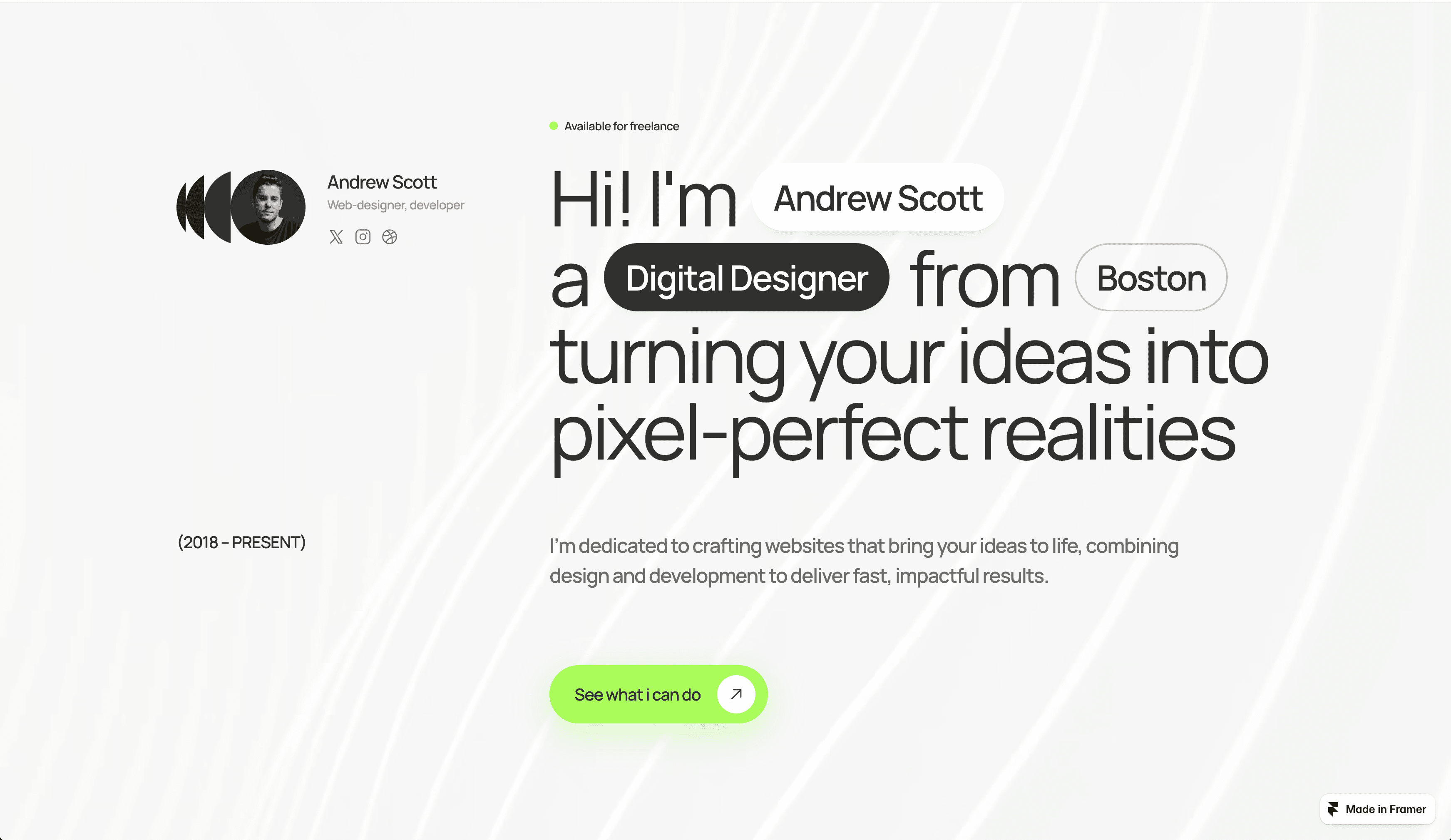 以下营销作品集示例,按照营销专业领域组织,由专家直接从Framer Gallery和Marketplace获取。这使得像你这样的专业人士能够根据自己的具体职业道路找到量身定制的灵感,从全栈创意机构到小众自由内容策略师。