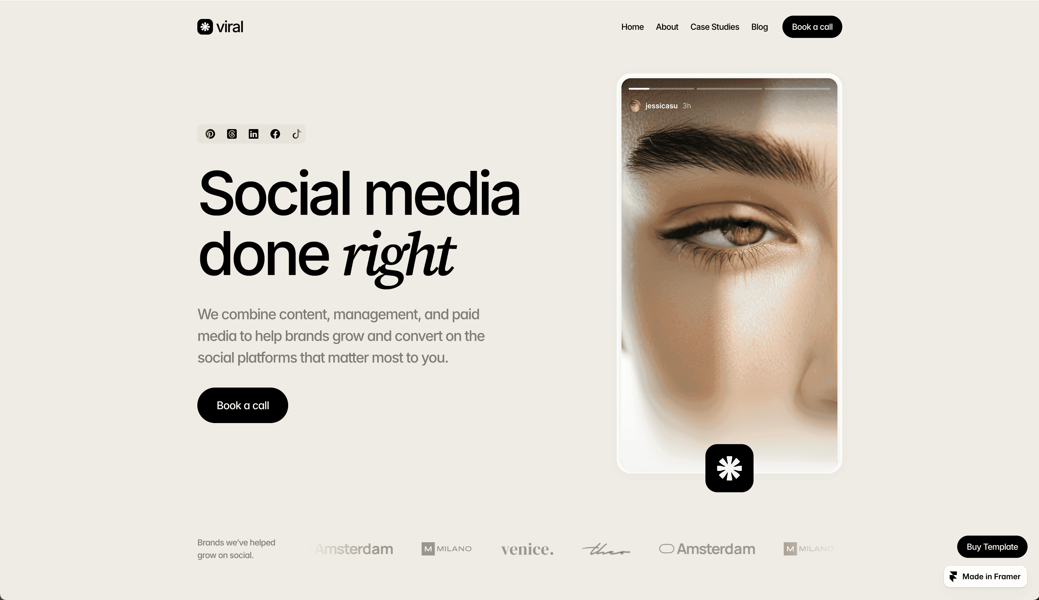 一款专为内容优先和以活动为中心的作品集定制的优质模板。Viral 的8页模板专为需要展示视觉内容(包括短视频和社交媒体轮播)的数字营销人员设计。它也同样适用于内容创作者自身的作品集。