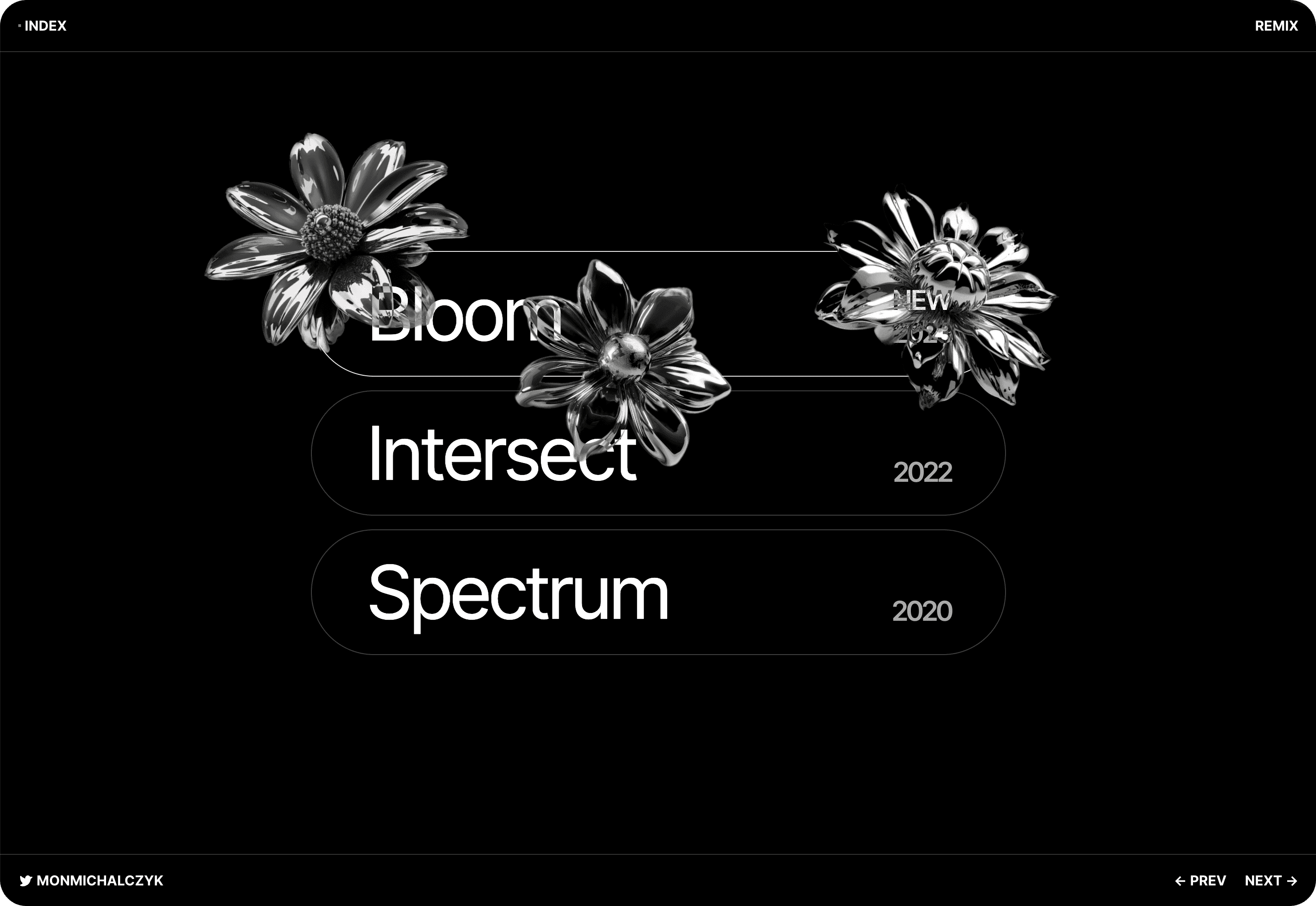 在此示例中,我使用悬停交互,当您将鼠标悬停在项目上时,图像会出现。图像在初始状态下透明度设置为 0%,它们很小且居中。在悬停状态下,我使图像可见,放大它们,并将它们移出边缘,以使它们看起来更具动态感。我还使用“差值”混合模式为我的文本元素创建这种半透明效果。我为每个项目制作了单独的变体,因为每个效果都是定制的。
