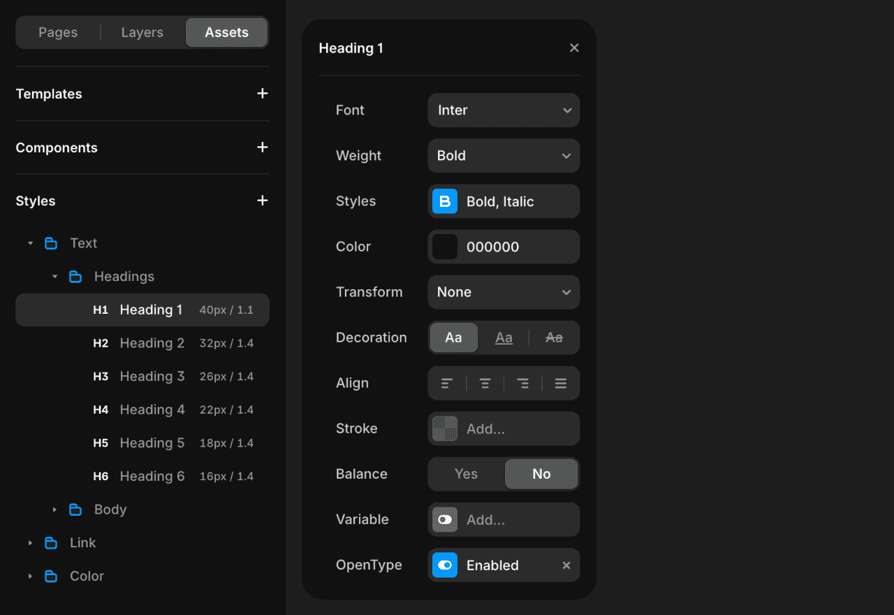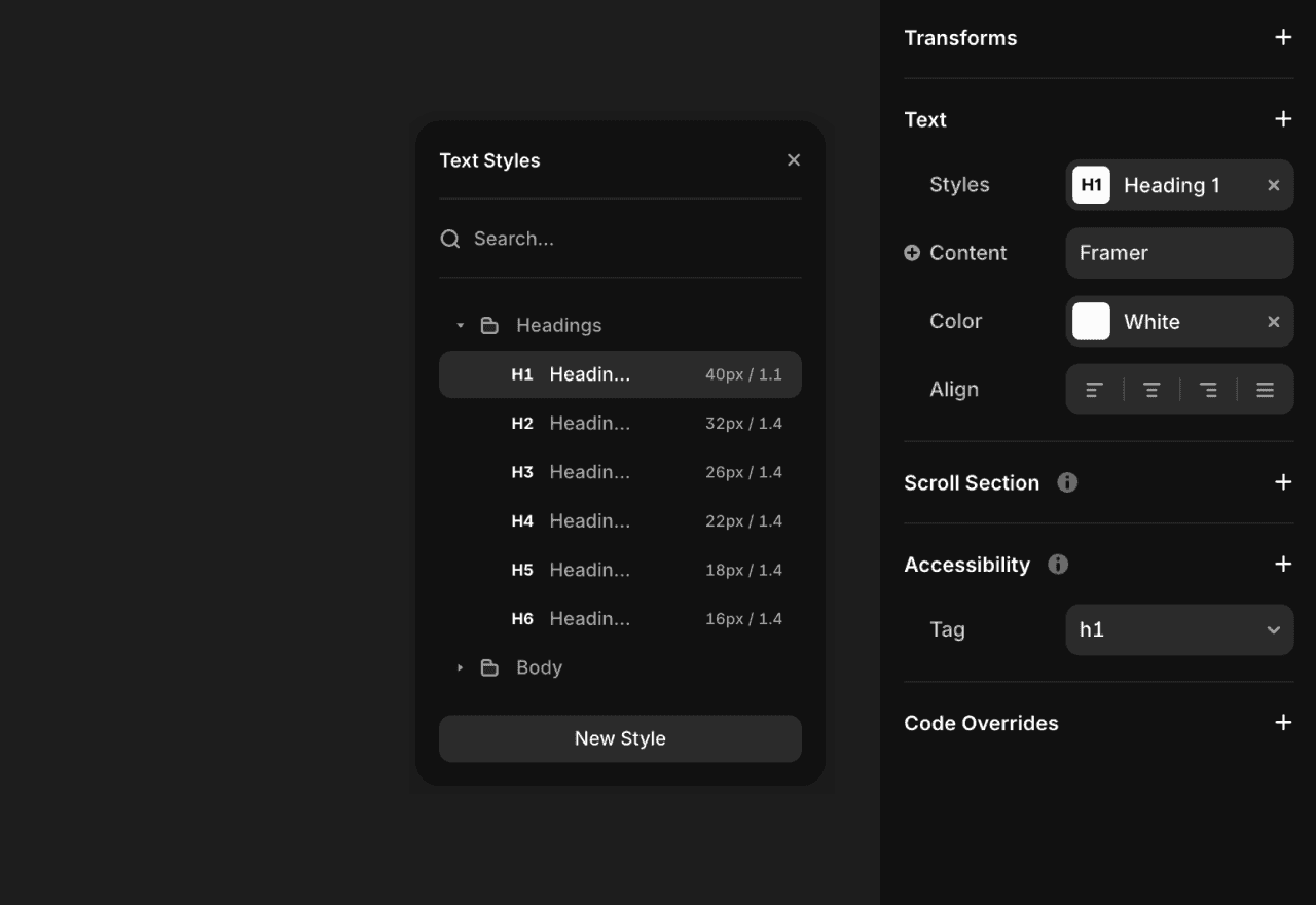 Framer 通过其文本样式系统自动处理内容层次结构。它将正确的语义标签(H1-H6、p 或 span)添加到您的文本样式中,无需额外工作即可创建正确的 HTML 结构。想要调整这些标签?只需打开可访问性面板即可快速自定义。