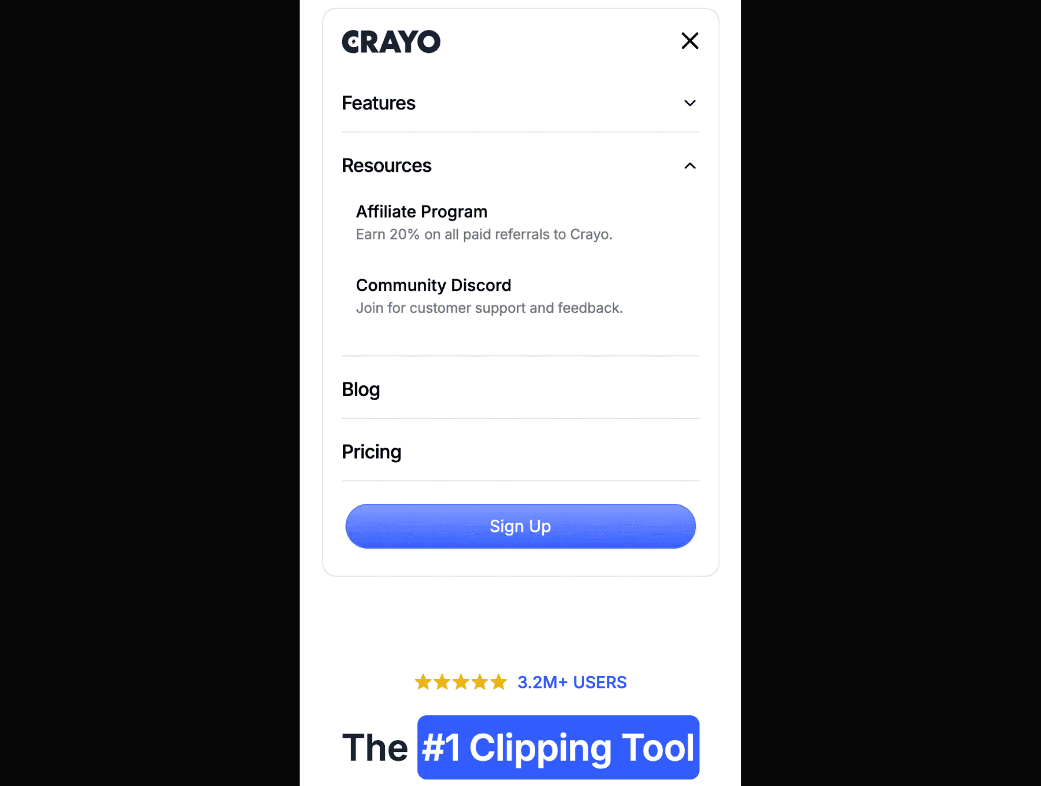 Crayo使用手风琴菜单来组织大约十几条链接,这些链接通常可以通过网站桌面版本的下拉导航进行访问。在移动设备上导航大量链接会很快让人不知所措,因此关键在于提供上下文。Crayo 在这方面做得很好,它在每个菜单项下方显示简短描述,并用标题组织较大的列表。