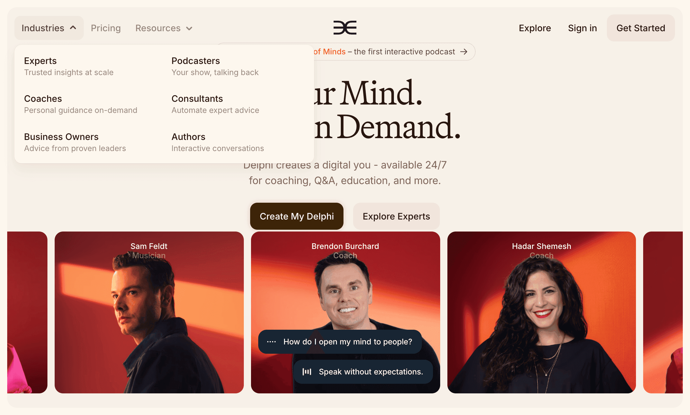 Delphi的下拉菜单具有超强的响应性,菜单项通过平滑的淡入动画在几毫秒内出现。箭头表示下拉菜单项的存在。导航栏打破了常规,将徽标放在中央而不是左侧,但这种权衡是值得的——这里存在清晰的组织逻辑,右侧是行动导向的链接,左侧是信息性链接。