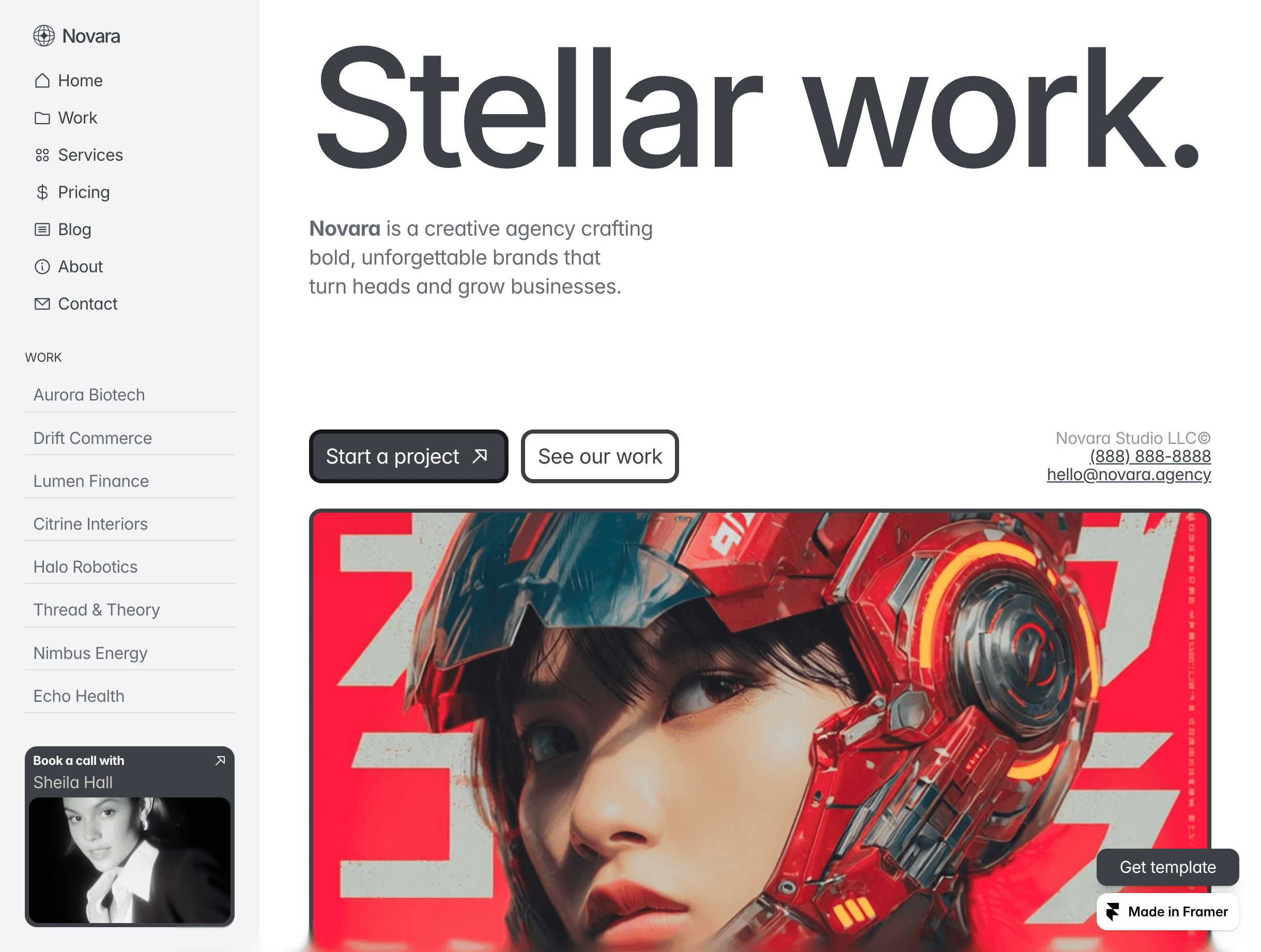 作品集网站有时会选择侧边栏导航,因为它既能打开网站主体,又能为菜单项增加更多空间。Novara(一个 Framer 模板)是这种工作方式的一个很好的例子:它允许在不同项目之间进行一键导航,包含一个视觉化的“预订通话”CTA,并且仍然有空间放置“关于”和“定价”等标准菜单项。