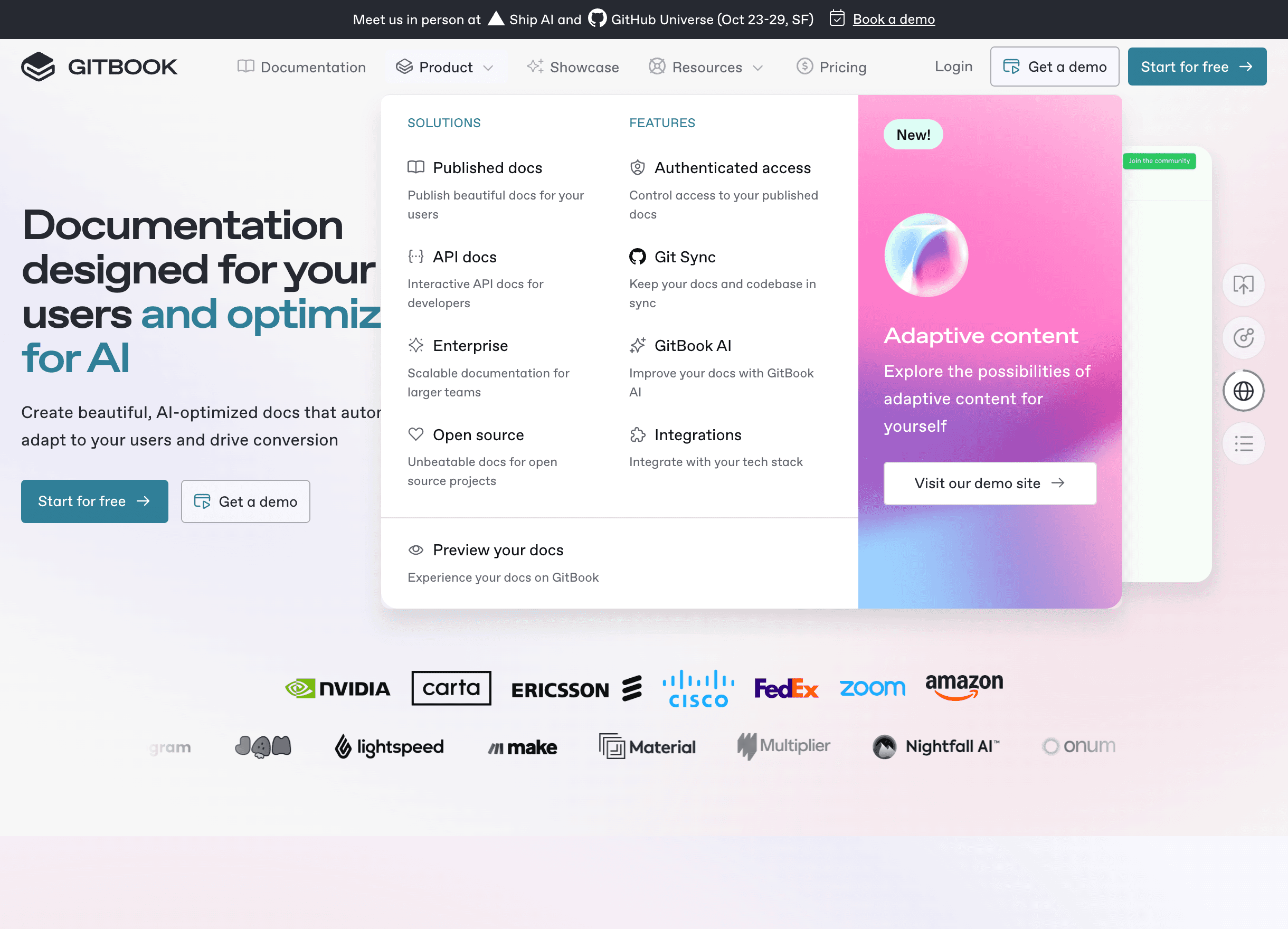 Gitbook很好地利用了其超级菜单。菜单的每个列都作为即时可见的子菜单,减少了需要放入导航栏的链接数量。Gitbook 还通过包含图标和简短描述来方便地导航内容,并将整个超级菜单列变成了一个醒目的 CTA,引导用户使用新功能。
