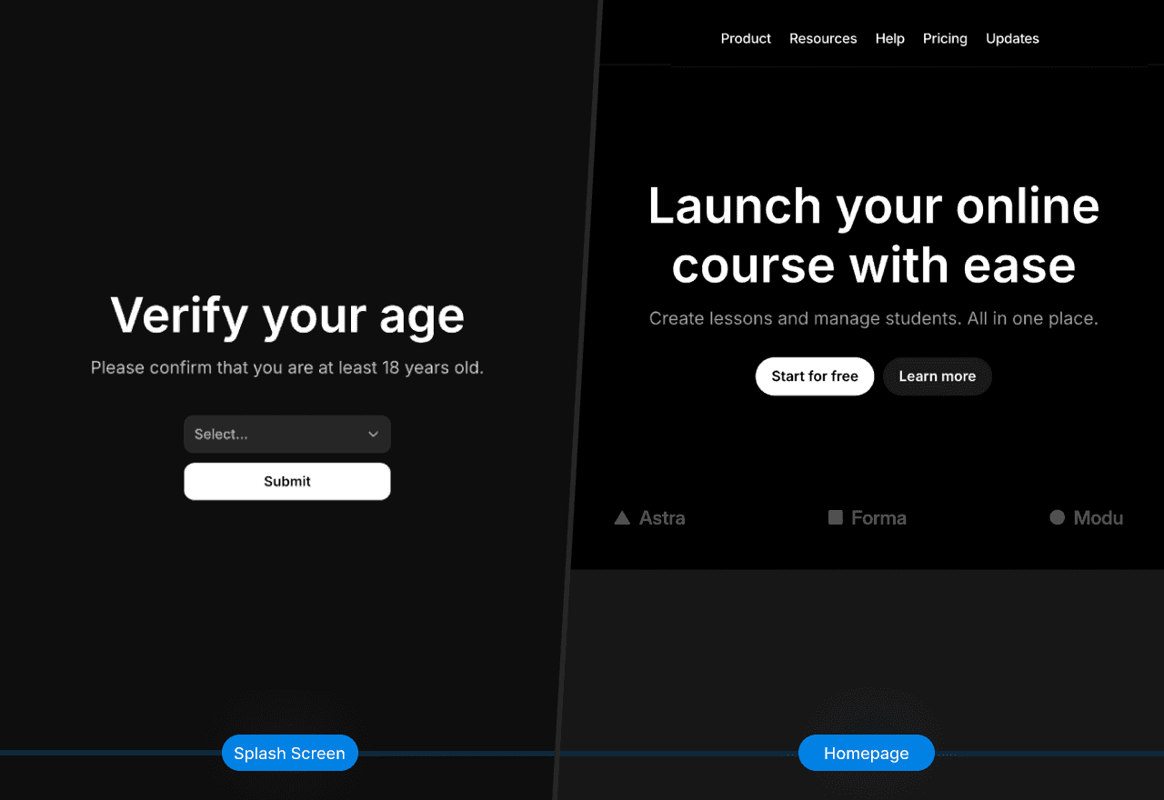 决定你的开屏页是在每次访问时出现,仅在首次访问时出现,还是根据特定条件(如流量来源或用户位置)出现。精确规划用户在与你的开屏页互动后将前往何处。为不同的用户选择(年龄验证、地区选择等)创建独立的路径,并测试每个重定向,以确保它们正常工作。