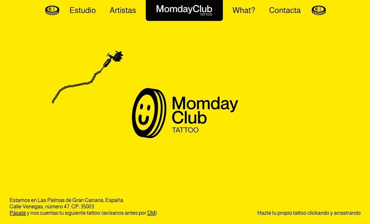 Momday Club 是西班牙拉斯帕尔马斯大加那利岛的一家纹身工作室,它通过让用户用数字纹身机创建设计来立即吸引用户。虽然一个交互式网站可能不是你寻找纹身工作室时最大的卖点,但它确实令人难忘,并且很可能会让用户在网站上停留更长时间。虽然这从技术上来说不是一个开屏页,因为你可以立即访问网站菜单,但它也足够接近,并且提供了一个很好的例子,说明交互性带来的可能性。