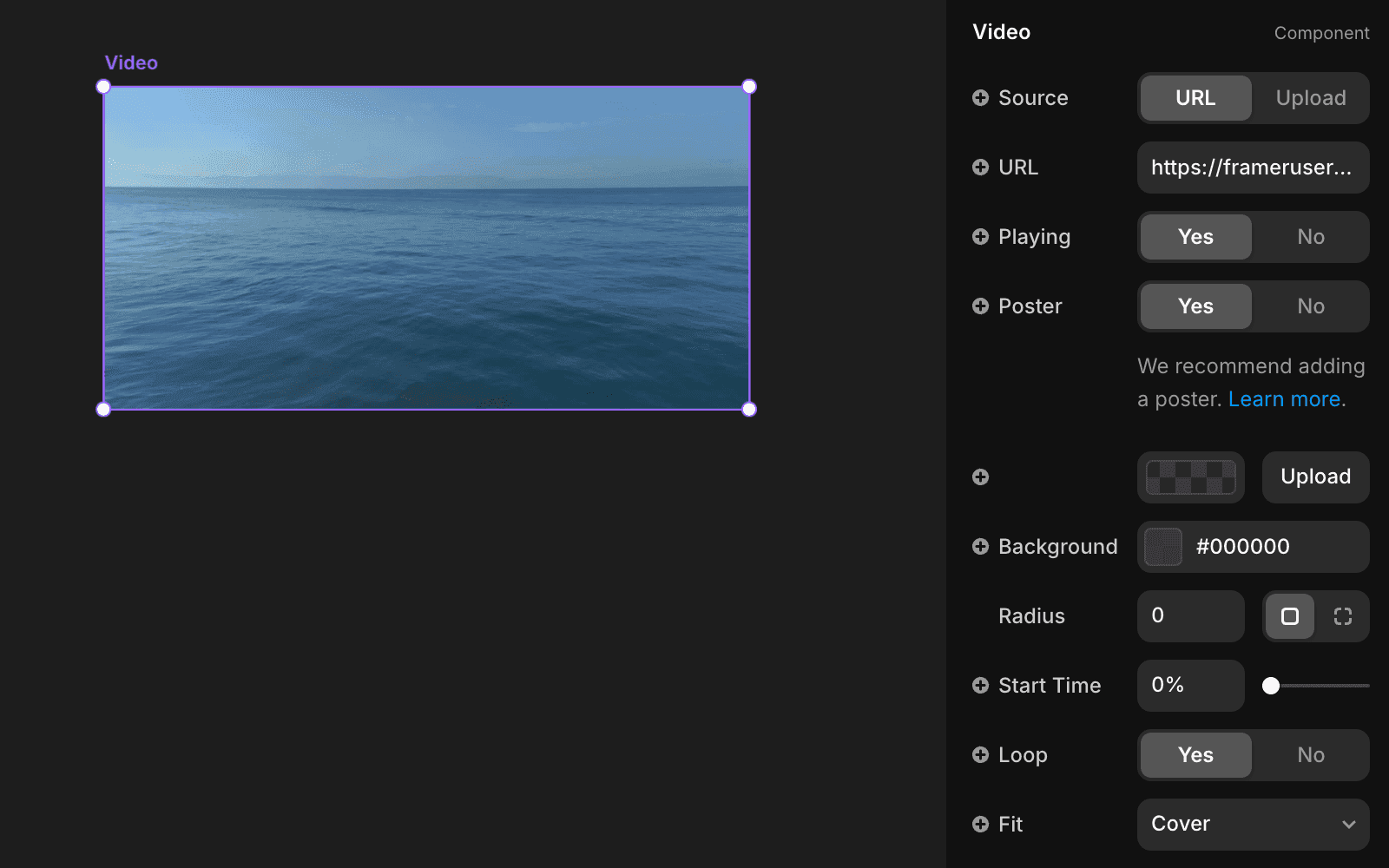 首先,在 Framer 页面中拖放视频组件到画布上。