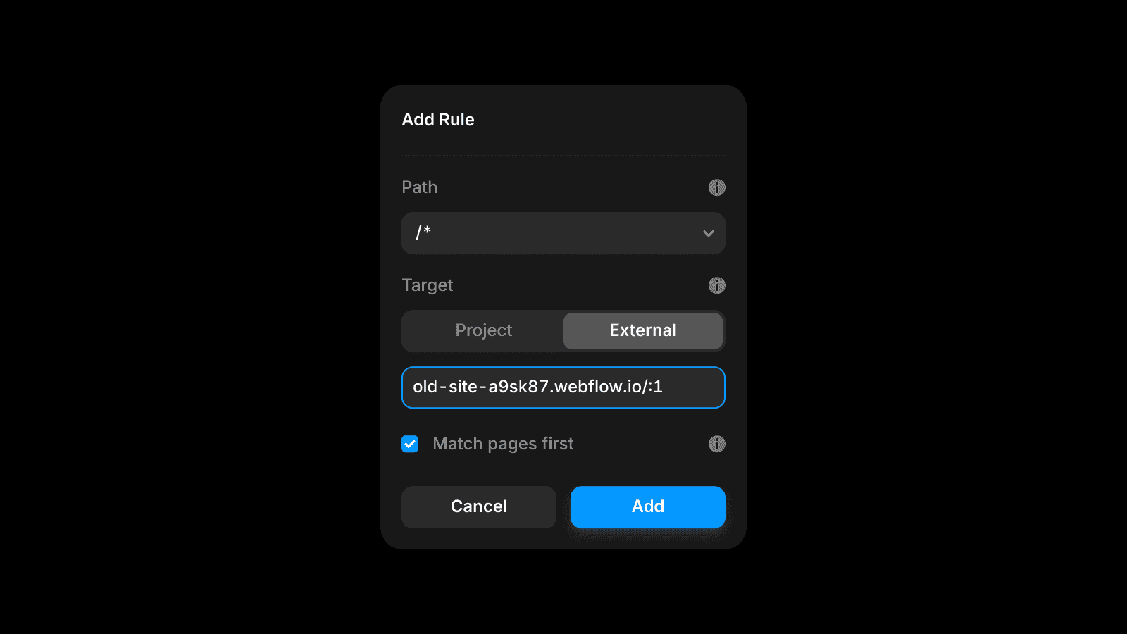 创建一个多站点规则,将所有流量路由到你的网站 old-site-a9sk87.webflow.io。通配符(路径使用 /*,目标 URL 使用 :1)会将规则应用于域名上的所有路径。