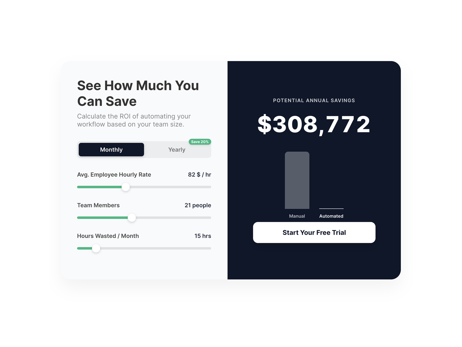 用交互式 ROI 滑块可视化投资增长:自定义标签、数值、颜色与设计以匹配品牌并提升参与度。